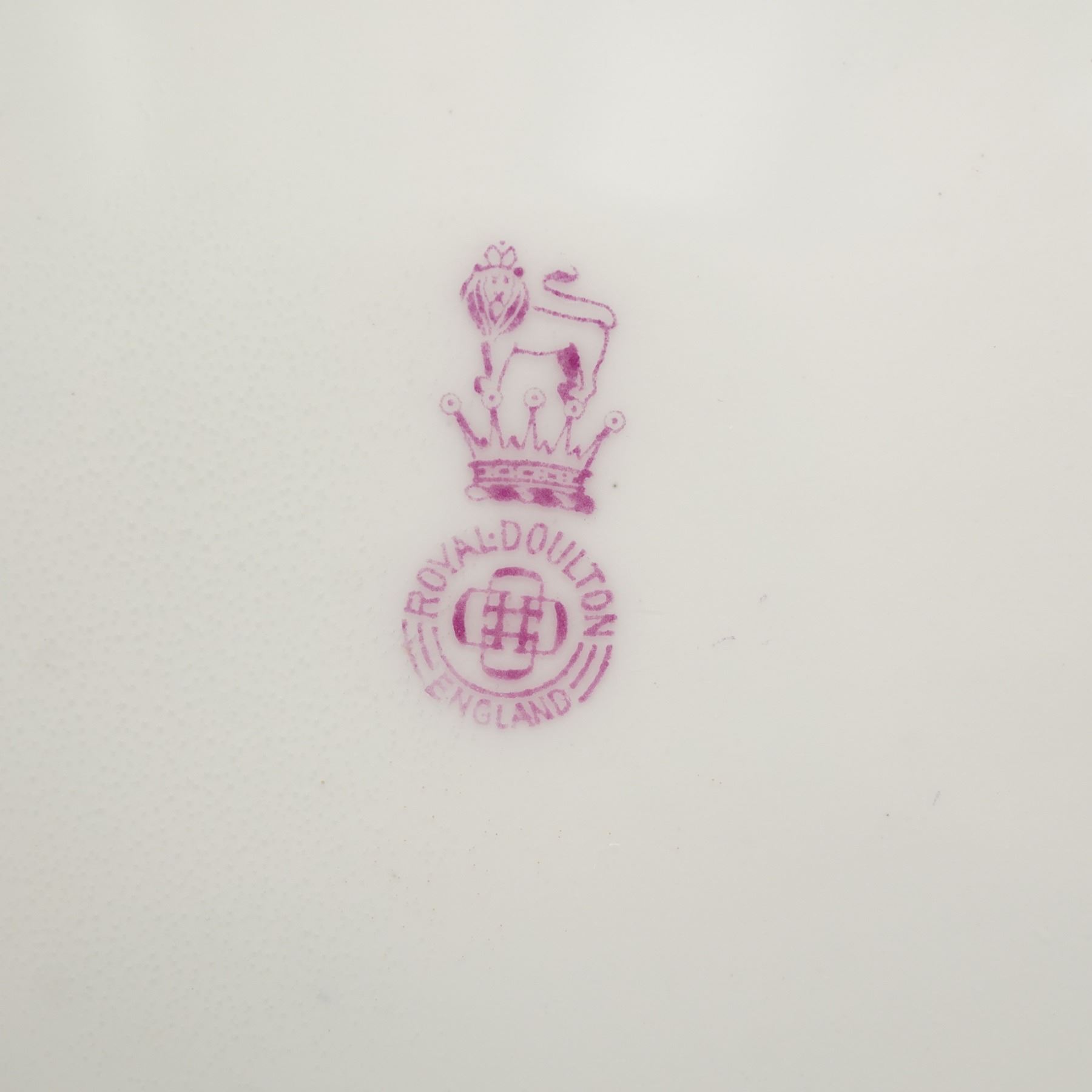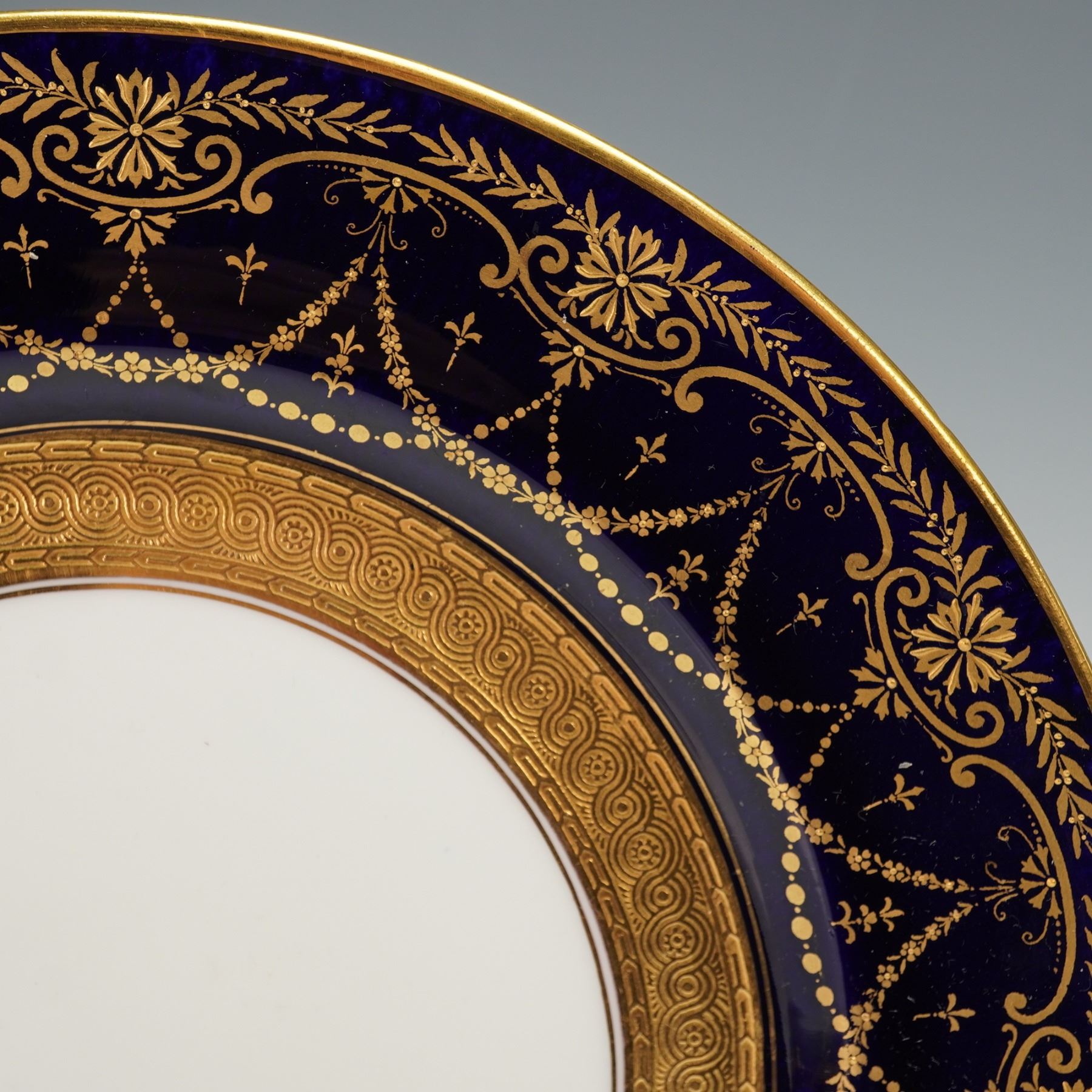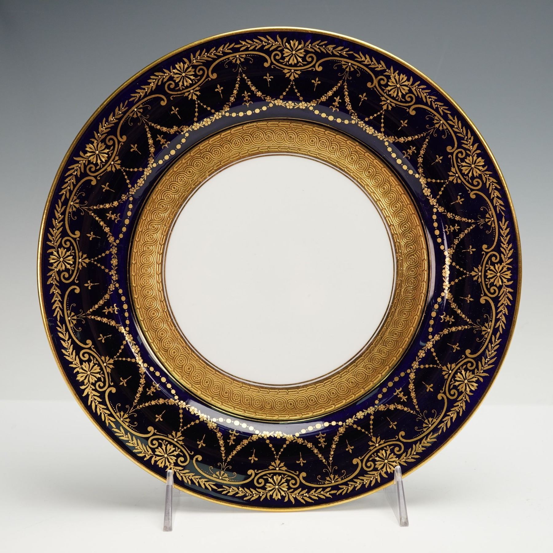 An elegant plate featuring a richly decorated cobalt blue ground adorned with intricate raised gilt scrollwork and festoon patterns. The inner border is embellished with an elaborate geometric gilt band encircling the white center. Handwritten in gilt "HB6934B" to the reverse. Royal Doulton backstamp.