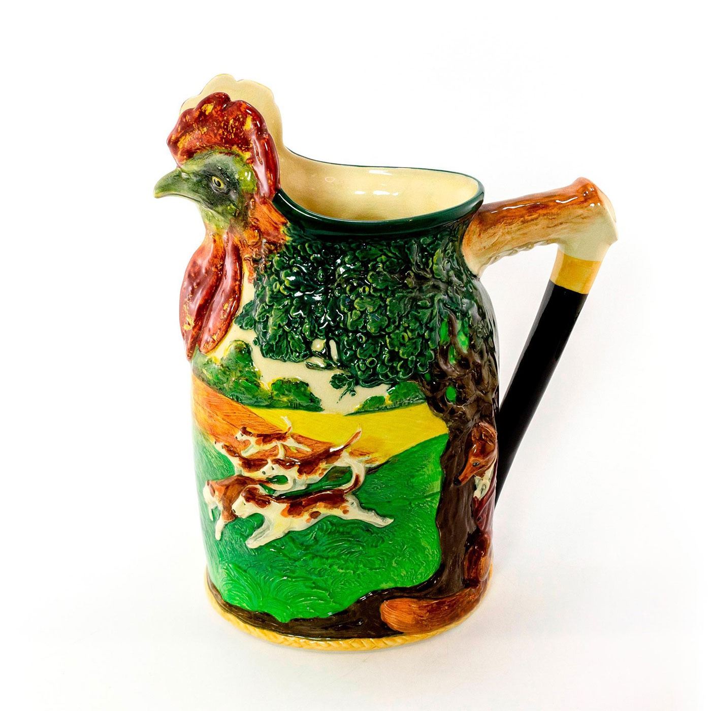 Large, oval shaped; rooster head spot. Limited edition 270 of 500. Extensive landscape shows pack of hound running across a field hunting for the fox who sits under the tree watching in relief. The handle is modeled as a whip with thong trailing around the base. Doulton backstamp. Age related crazing.