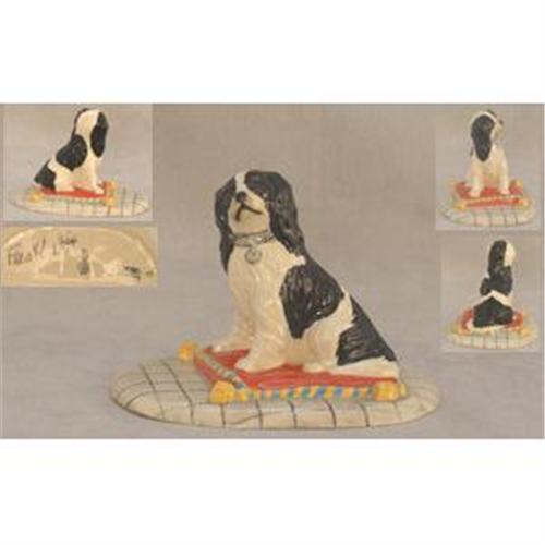 Royal Doulton Prototype Model Of A King Charles Spaniel Signed Fiona H And Dated 1.4.04 Design Original Sample To Base. Similar To RDA 48 Black And White Dog Seated On A Red Cushion With Blue And Yellow Braid But Turned To The Left And Without Food Dishes