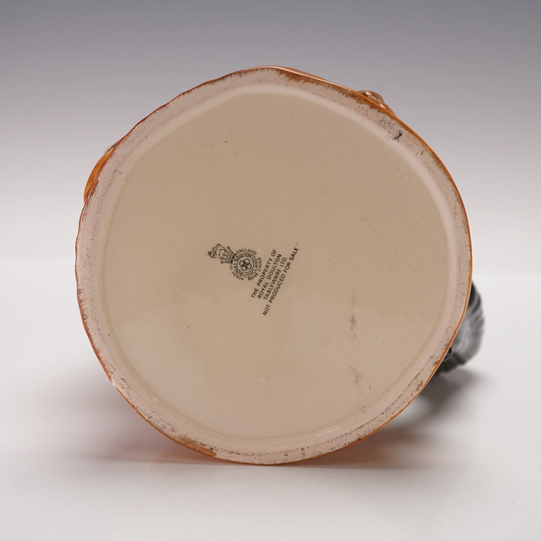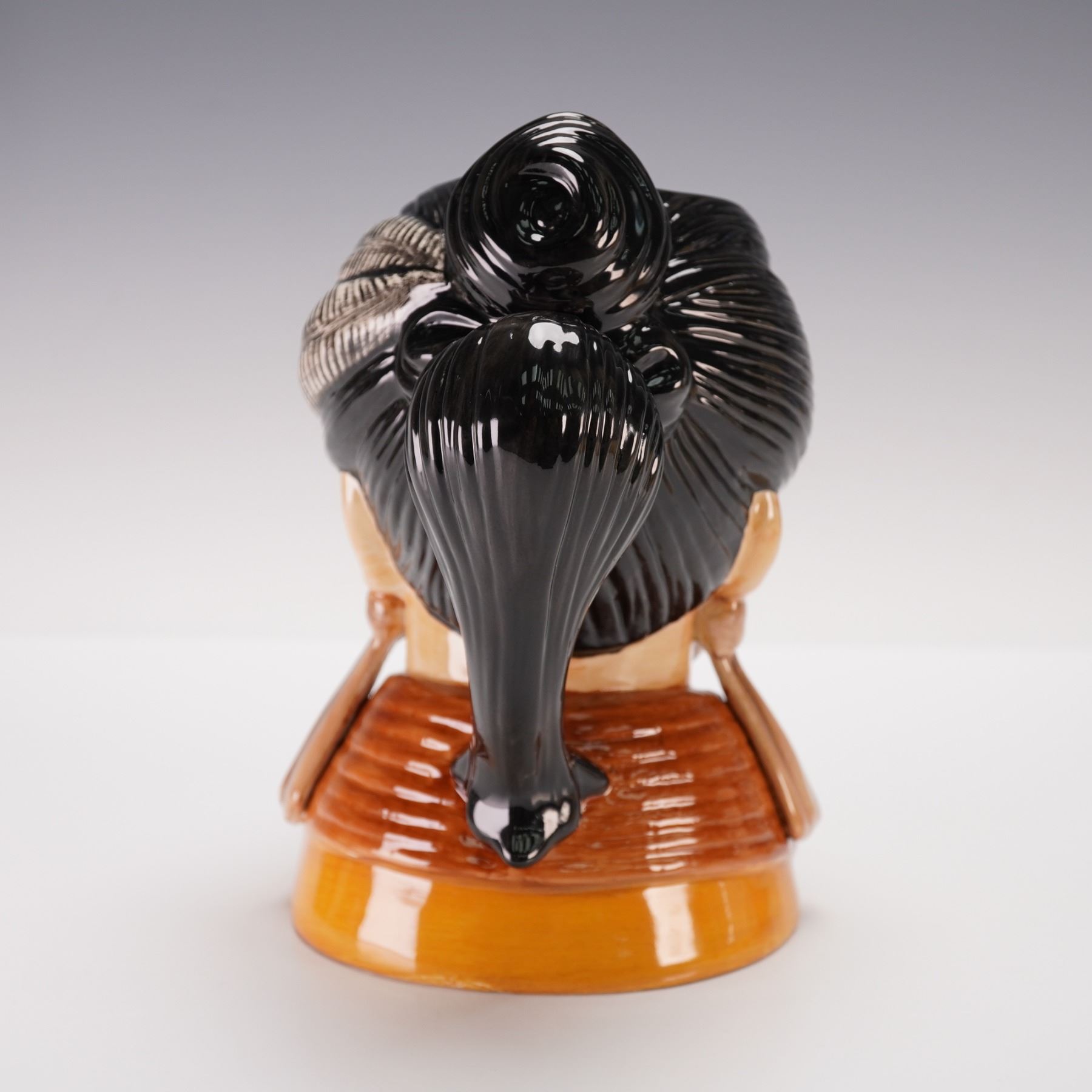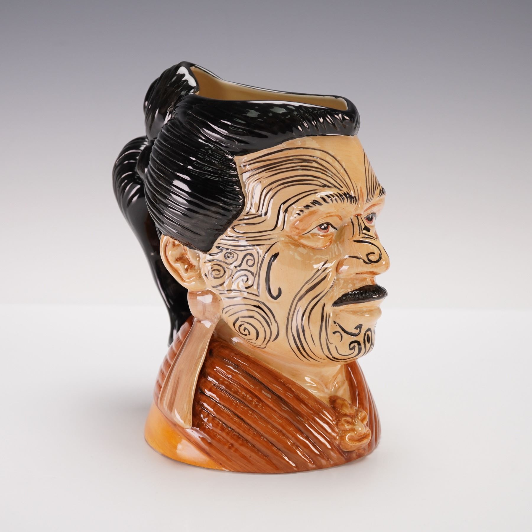 This Royal Doulton prototype character jug portrays a Maori figure dressed in rust-colored attire, accented with a tan pendant. The jug is beautifully detailed with black hand-painted patterns of Maori tribal markings, capturing the essence of a native inhabitant from New Zealand and the Polynesian Islands. The base is marked The Property of Royal Doulton Tableware LTD. Not Produced for Sale along with the Royal Doulton backstamp.