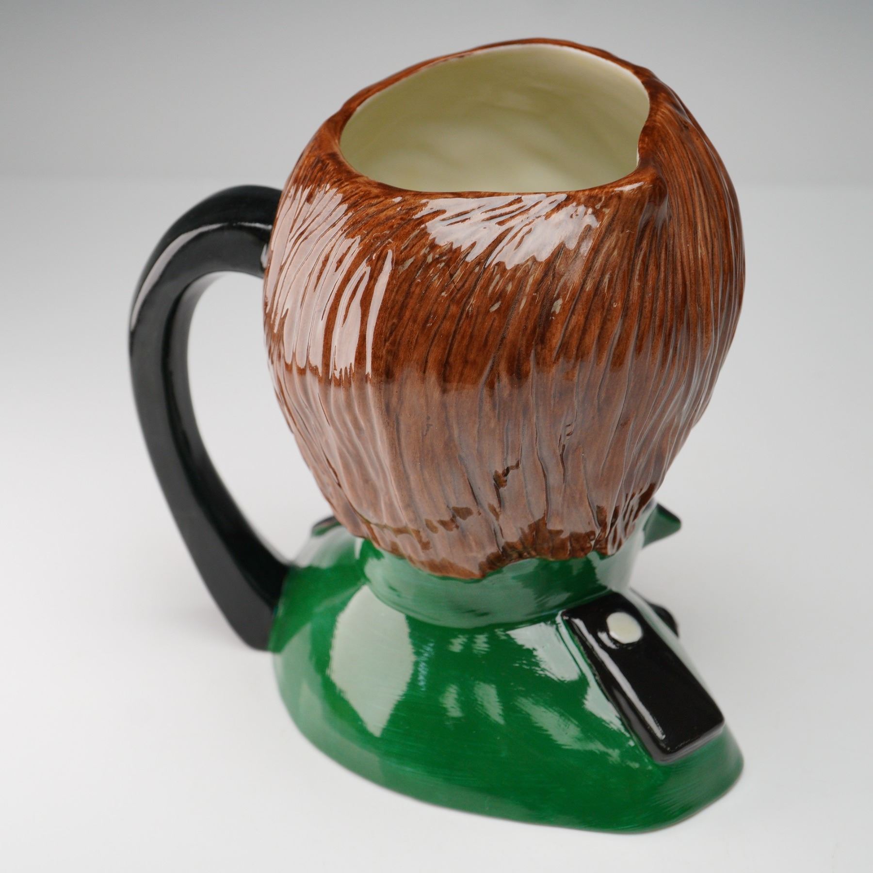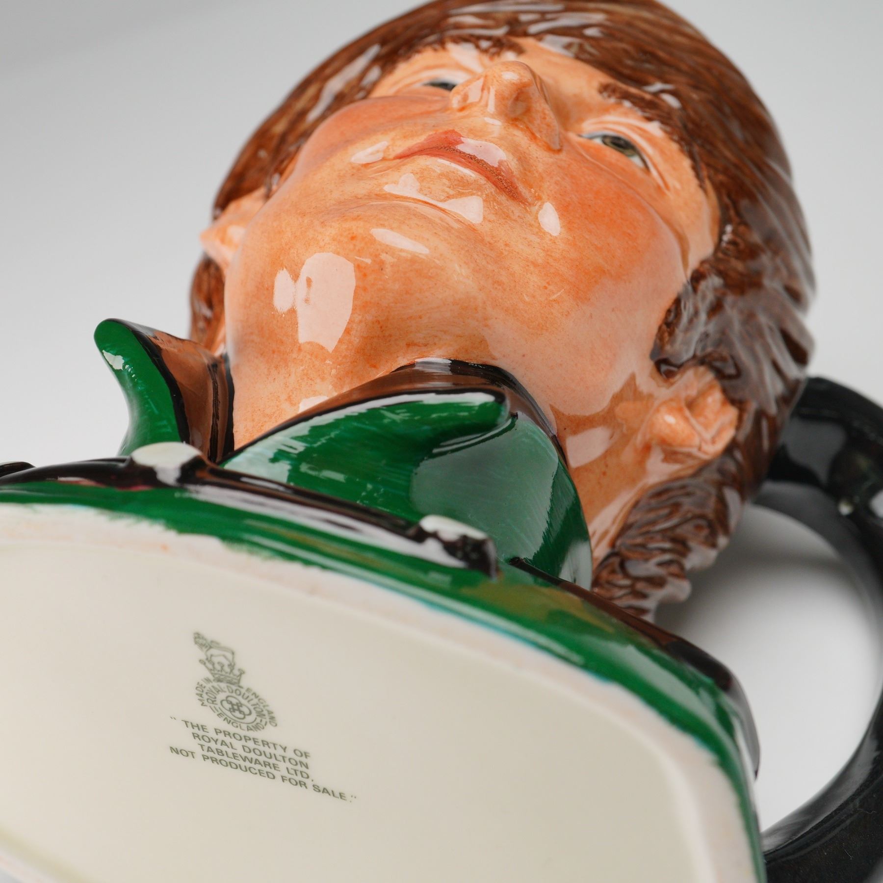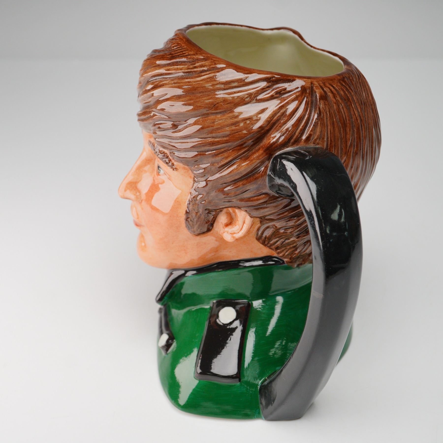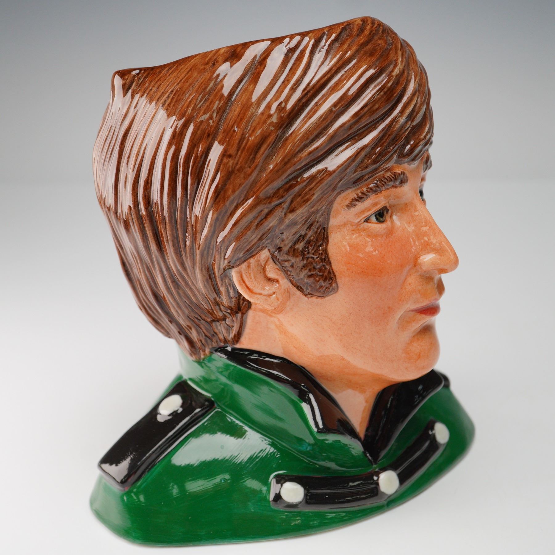 A rare Royal Doulton character jug modeled as John Lennon, part of The Beatles series. This prototype features Lennon in a green jacket with black epaulets and a contemplative expression, showcasing detailed hand-painted features and high-gloss finish. The underside bears the Royal Doulton backstamp and is marked "The Property of Royal Doulton Tableware Ltd. Not Produced for Sale," indicating its status as a factory prototype. This piece was never released for commercial production, making it highly sought after by collectors of Beatles memorabilia and Royal Doulton prototypes. Royal Doulton backstamp. Measures 5.5"H.