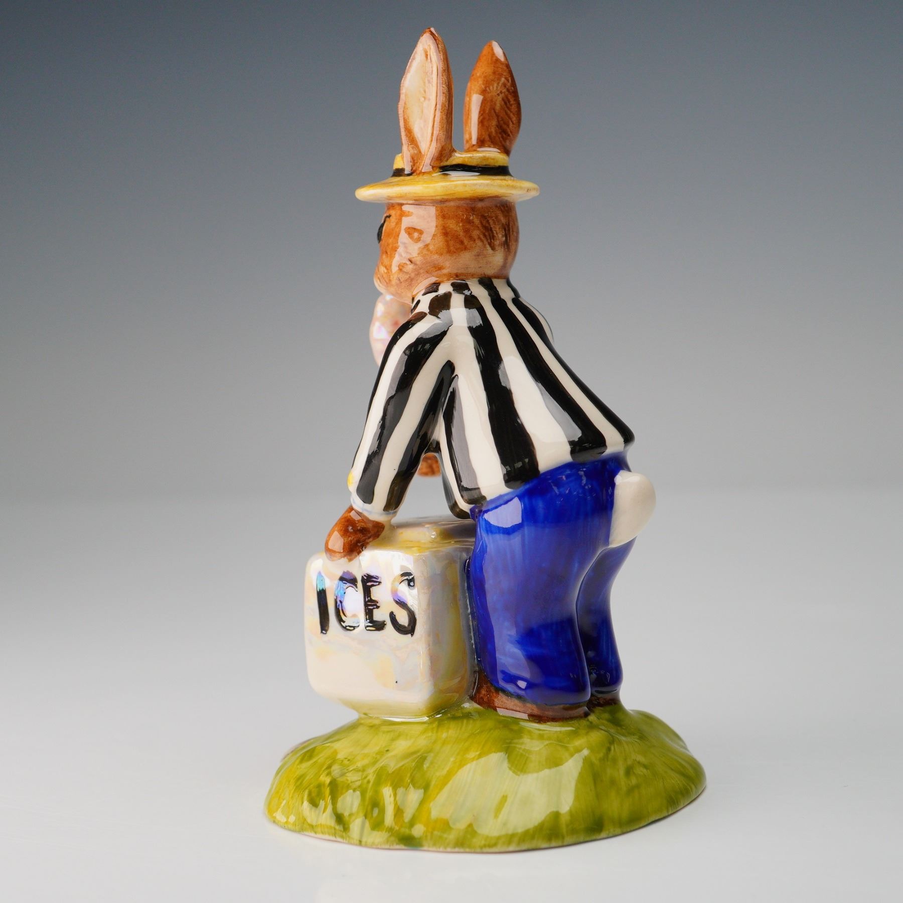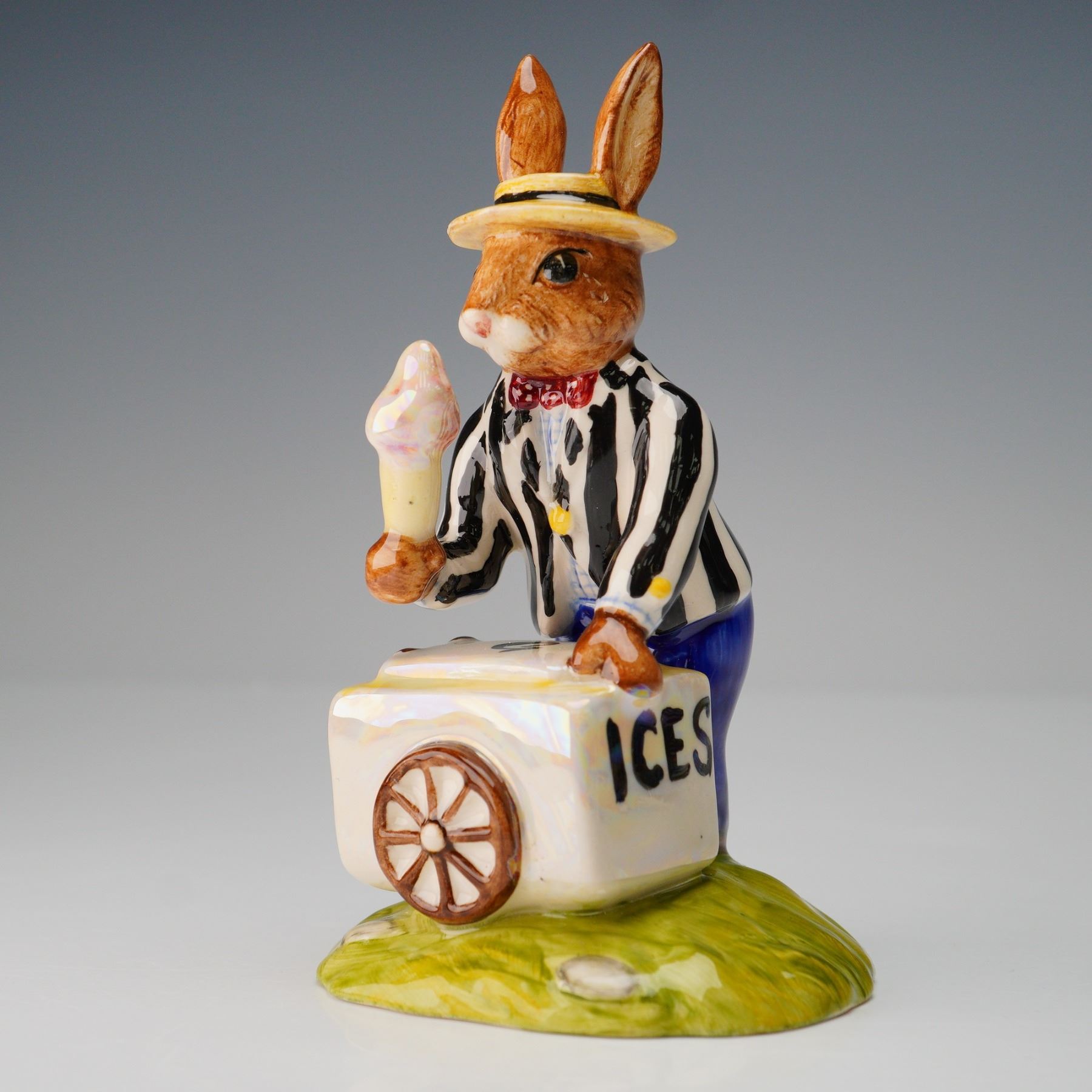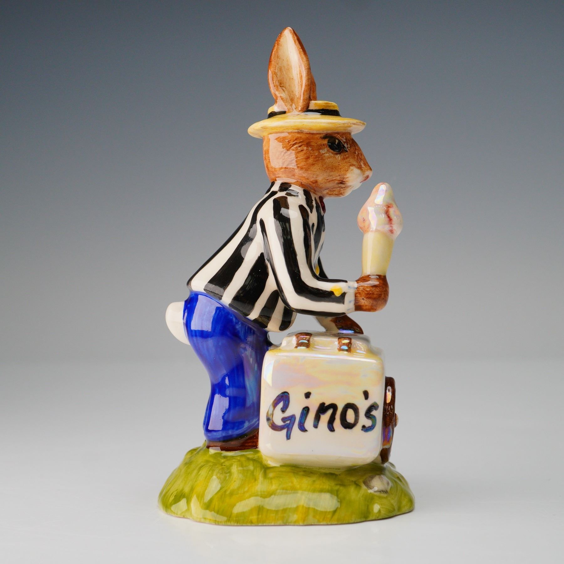 Hand painted colorway modeled as bunnykins holding an iridescent ice cream cone, Bunnykins wears a white and black striped coat, blue trousers, yellow hat and stands behind an iridescent cart title Gino's Ices. Royal Doulton backstamp.