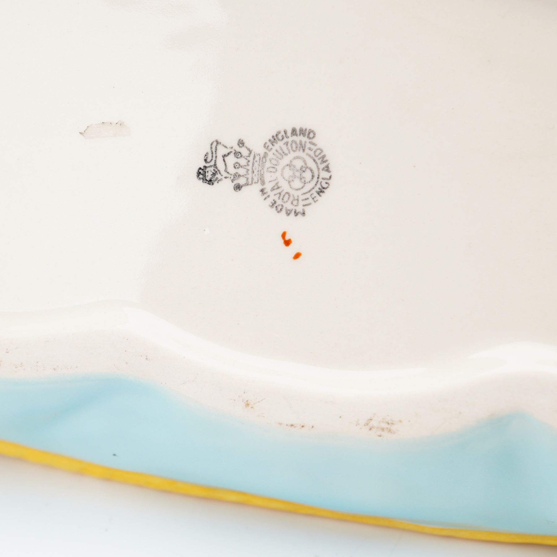 This glazed ceramic figurine depicts a recumbent poodle, sculpted with a textured coat in a highly lustrous white finish, resting upon a plump rectangular cushion. The cushion upon which the animal reposes exhibits a light, cerulean blue colorway, bordered by a pronounced yellow cording detail. Royal Doulton backstamp.