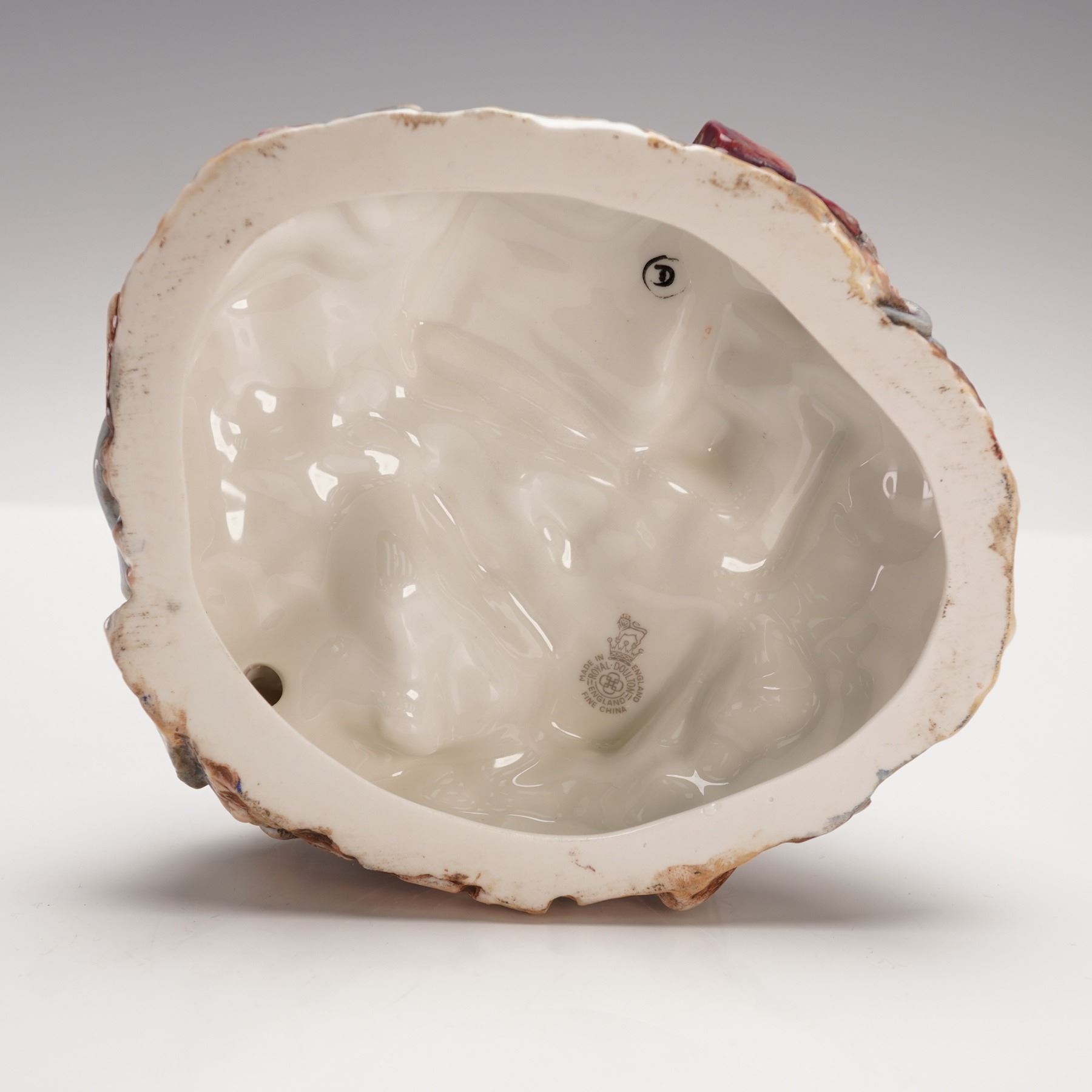 A Royal Doulton prototype colorway figurine of Winston Churchill, modeled by W.K. Harper. This variation features darker striped trousers and a lighter overcoat, with a distinctive base showing purple and cream coloration differing from the standard issue. The piece bears the Royal Doulton backstamp along with a circled D mark. Royal Doulton backstamp.