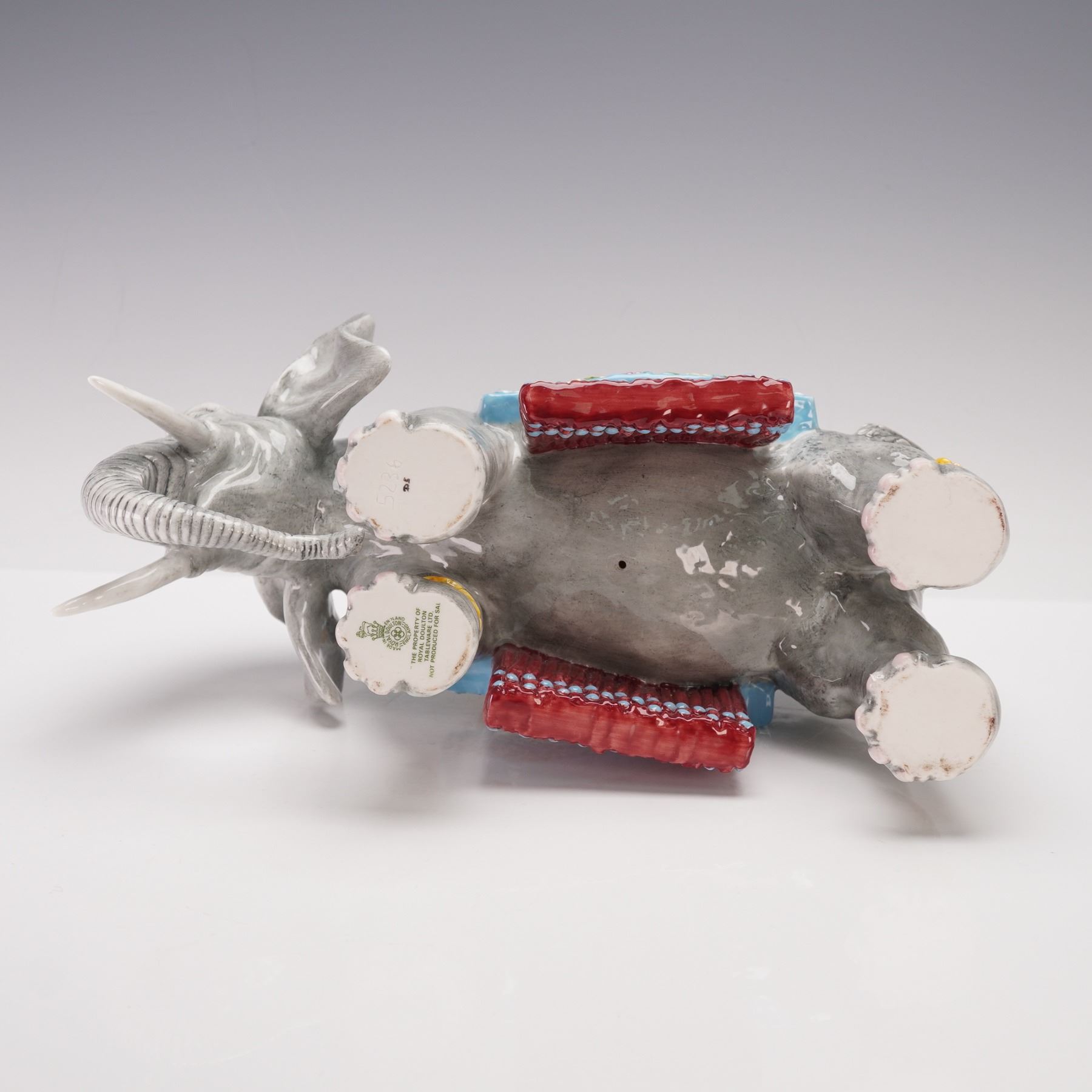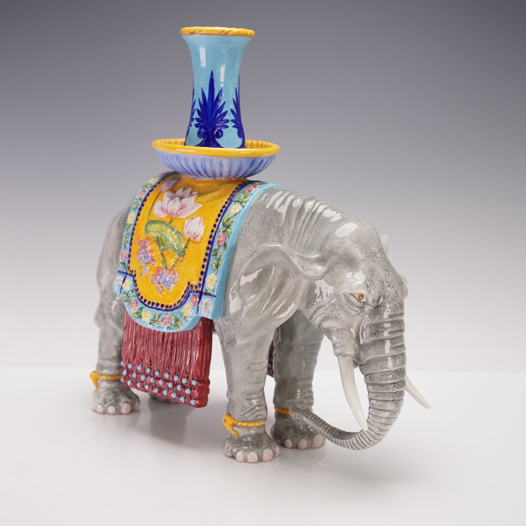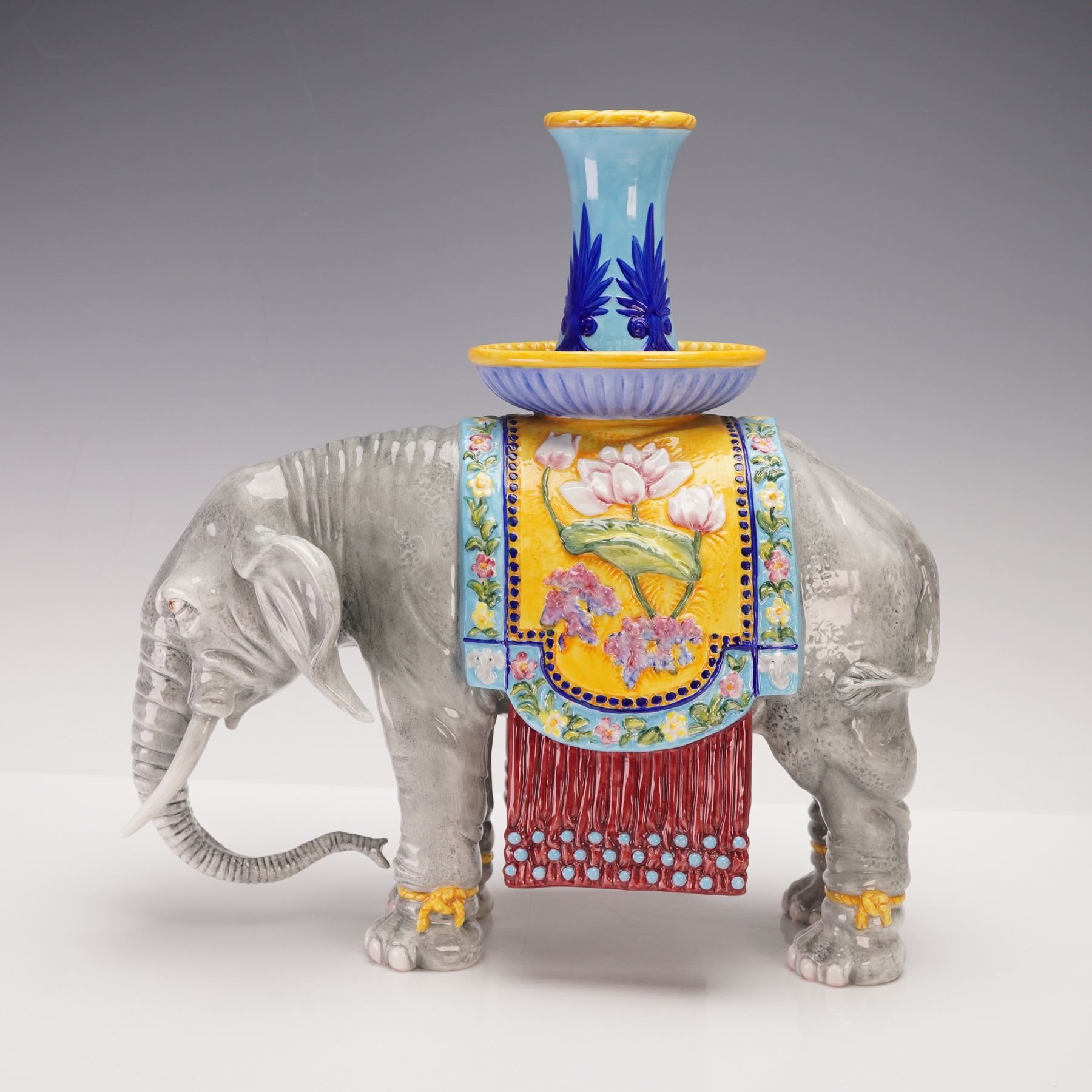 A rare Royal Doulton prototype candlestick modeled as a standing elephant with trunk lowered, finely hand-painted with a yellow and blue saddle cloth decorated with lotus flowers and floral borders, supporting a removable blue and yellow candlestick holder with cobalt foliate accents. The figure displays exquisite detail to the elephant's skin, trappings, and red tassel fringe. Marked underside with Royal Doulton backstamp and inscribed "The property of Royal Doulton Tableware Ltd. Not produced for sale."