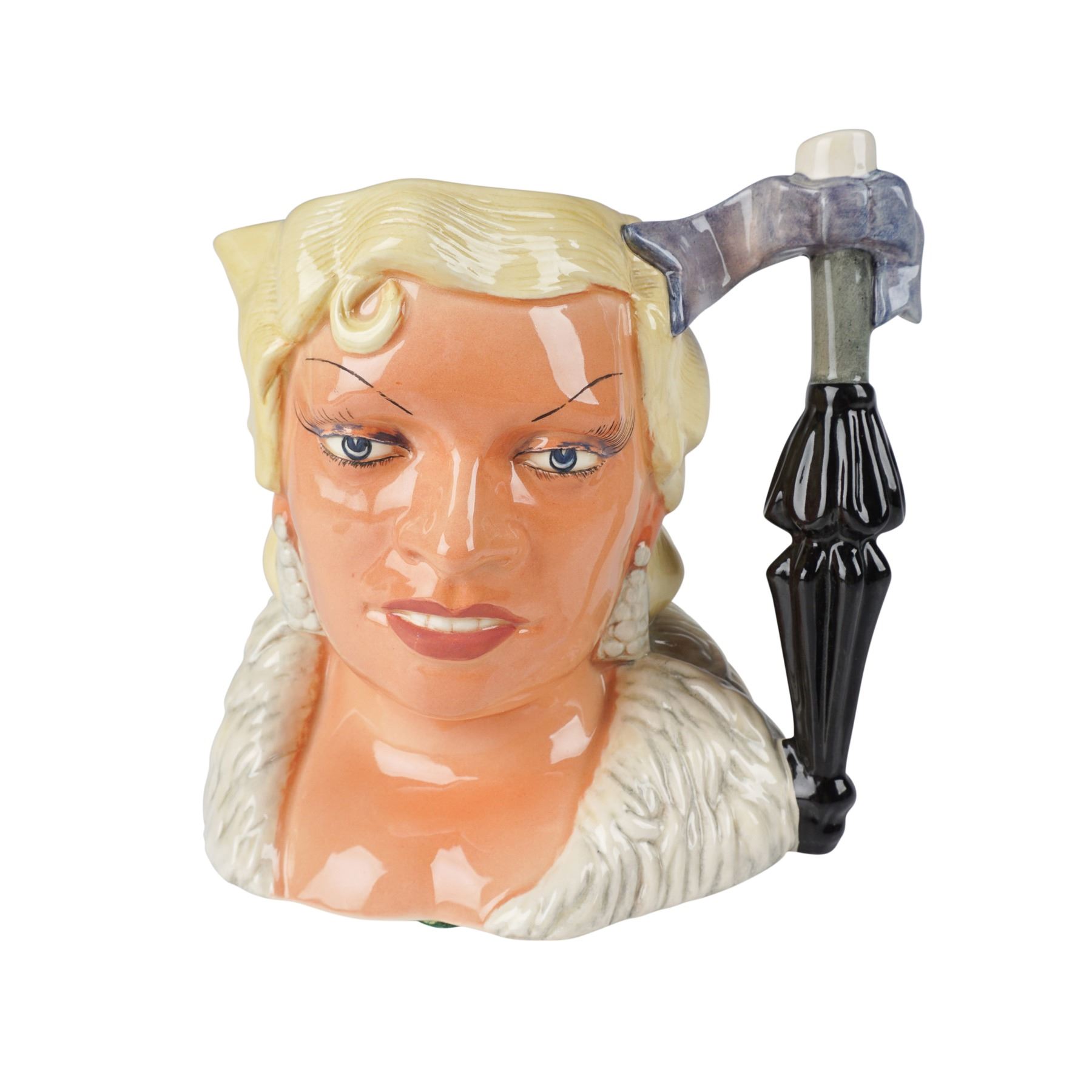 This is a rare Royal Doulton prototype large character jug depicting the iconic Mae West. Designed with exquisite attention to detail, the jug portrays Mae West with her signature glamorous style, complete with a fur-lined coat and a blonde coiffure. The handle features a hatchet design, adding a unique and dramatic flair. This one-of-a-kind prototype represents a piece of Royal Doulton's artistic and collectible history. Inscription by Dawn Lammas, who was a painter for the English china company Royal Doulton. Inscription reads: Nice meeting you, Earl. - Dawn Lammas, 1982.