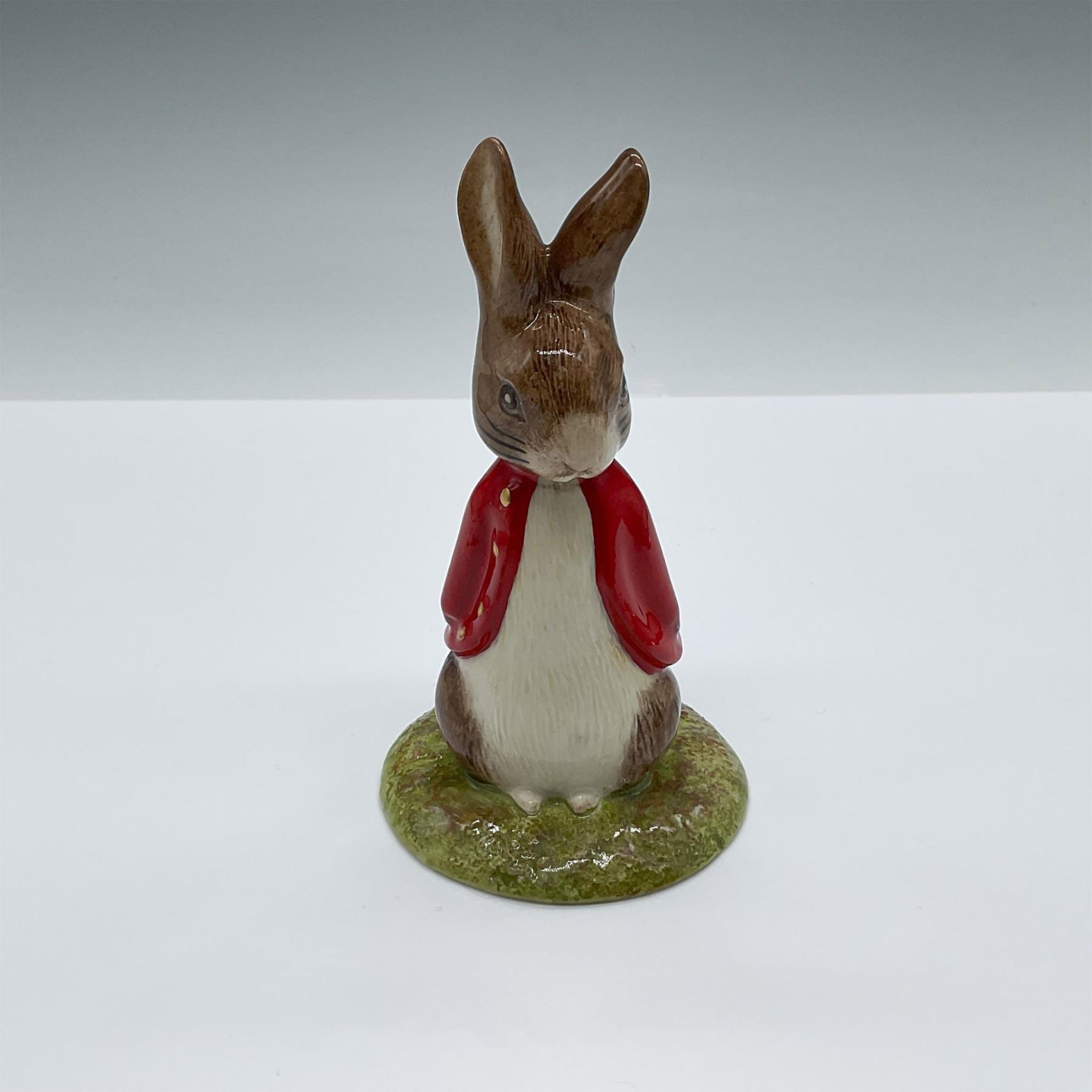 Beatrix Potter porcelain figure, Sweet Peter Rabbit. Hand decorated figure inspired by Beatrix Potter's 1902 children's book, The Tale of Peter Rabbit. Beige and cream rabbit with a scarlet-red jacket with golden buttons. Royal Doulton backstamp. Marked: GT Original Sample. Also marked: This Item Is The Property Of Royal Doulton (UK) LTD, And Title To The Property Remains With The Company At All Times.