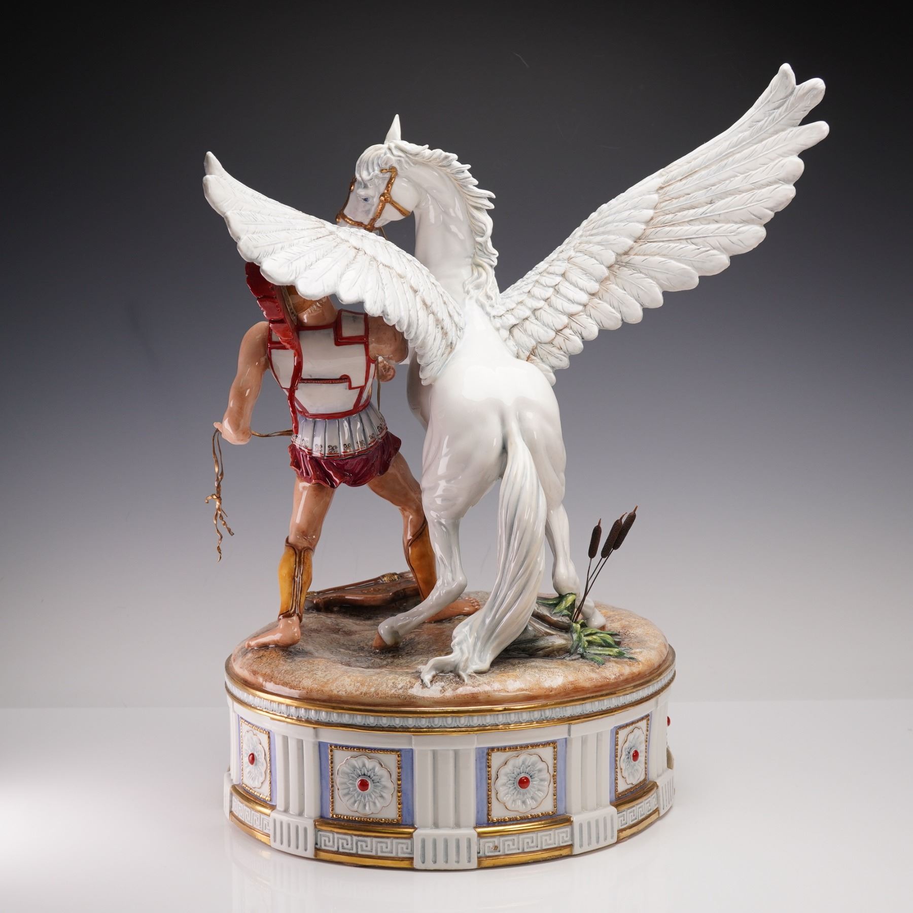 Porcelain sculpture depicting the Greek hero Bellerophon in armor adorned with the head of Medusa on his chest plate, shown restraining the rearing winged horse Pegasus. The piece displays detailed hand-painted decoration with gilded accents on the bridle, helmet, and armor, and is mounted on a round base decorated with Greek-style motifs, rosettes, and geometric borders. The underside bears the Royal Doulton backstamp, marked Prototype No. 1, signed by artist D. Capewell, and dated 2.2.07. Measurements are approximate and may vary slightly.