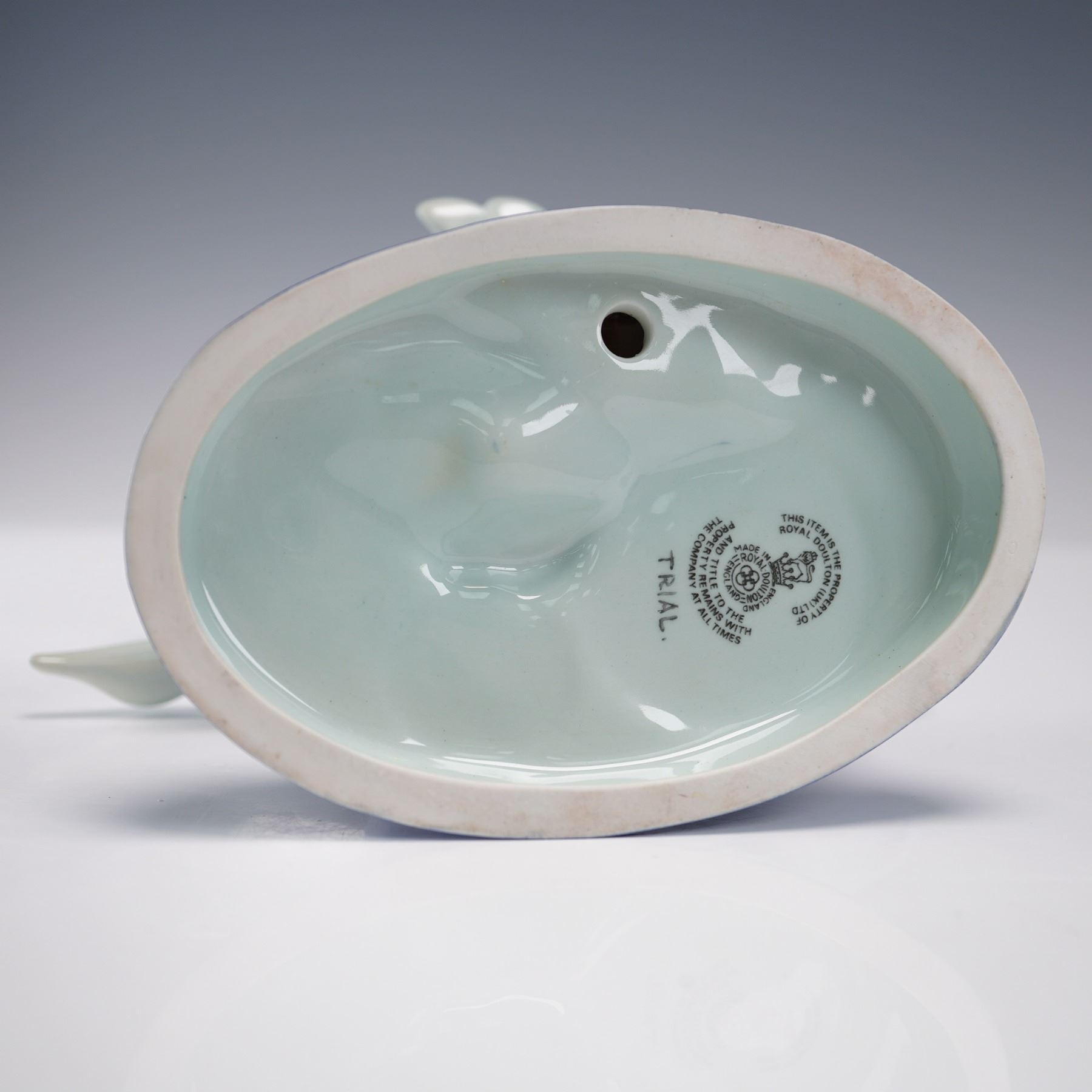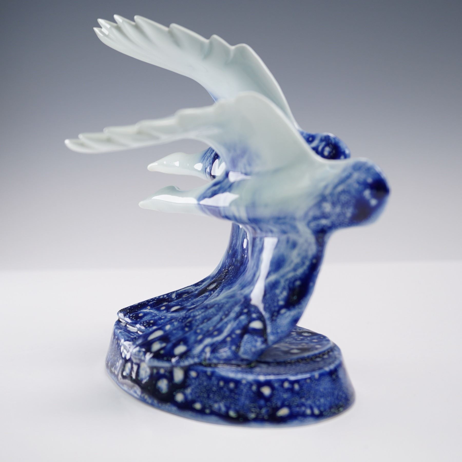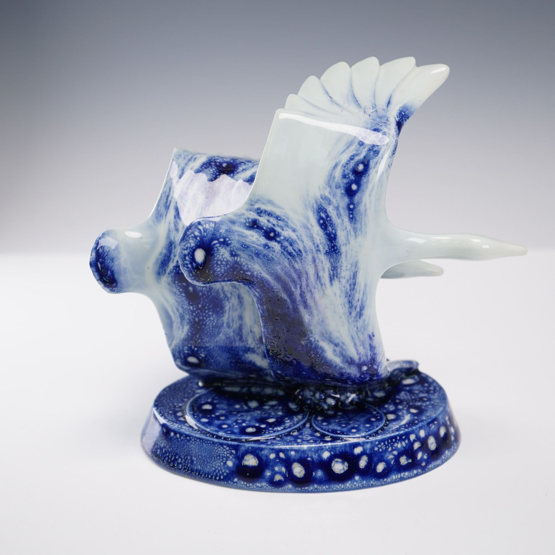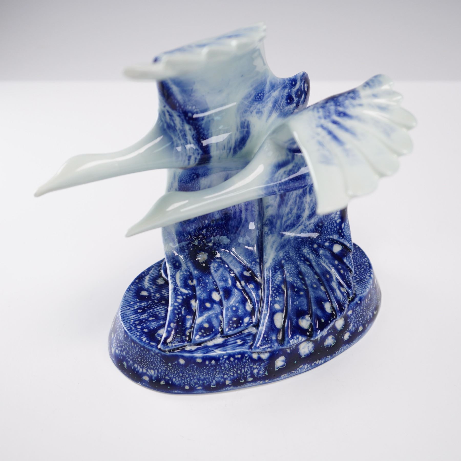 This trial prototype features two stylized geese in flight, depicted mid-air with elongated necks and outstretched wings. The piece is executed in a deep blue and white flambe glaze, with the color pooling and feathering in rich marbled patterns across the surface. The glaze displays varying tones of cobalt and light blue with high gloss finish throughout. Stamped with the Royal Doulton mark and accompanied by the statement: "This piece is the property of Royal Doulton (UK) LTD., and legal ownership is retained by the company at all times." The underside is marked by hand with the word "Trial."