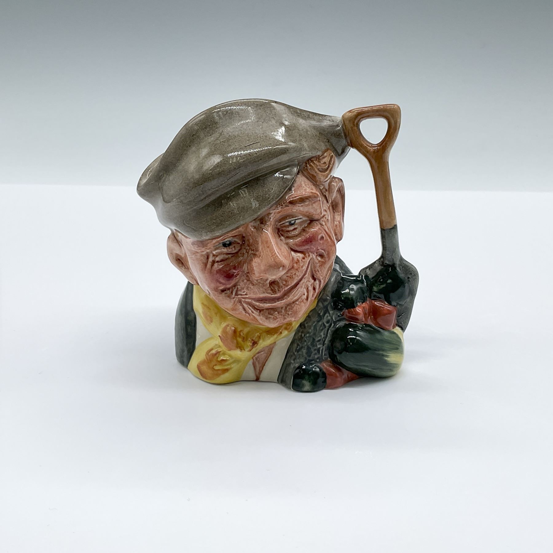 Hand painted and hand decorated figural jug of a man in a light brown cap, gray sweater and a yellow scarf. The handle shaped as a shovel with various vegetables. Royal Doulton backstamp.