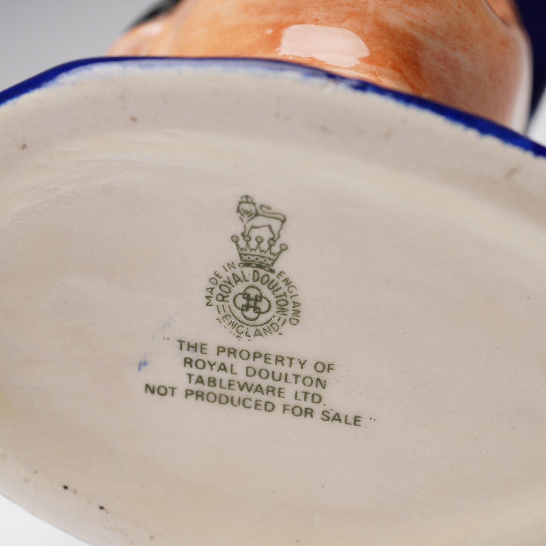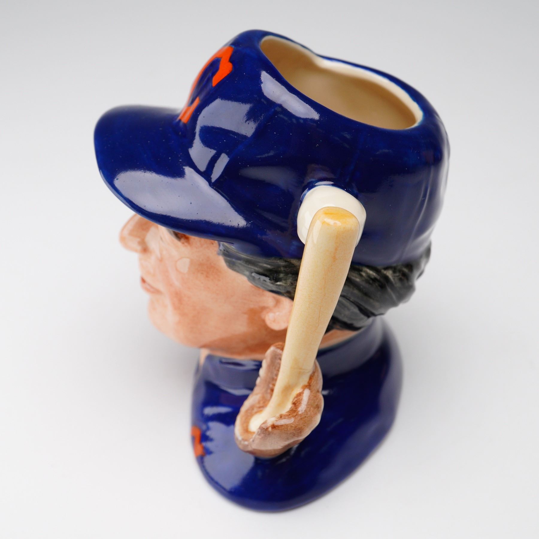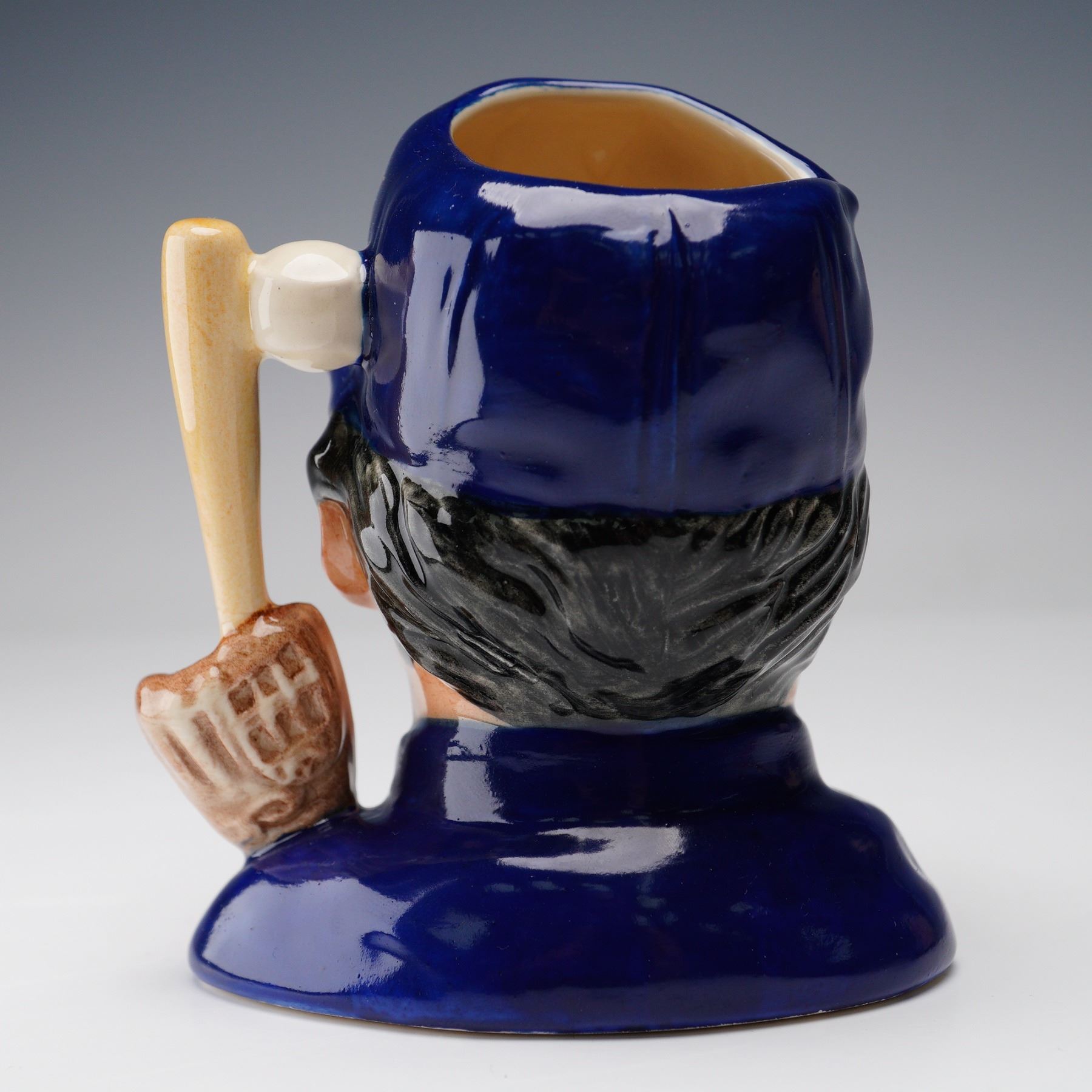 This Royal Doulton prototype character jug depicts a baseball player wearing a blue cap. The handle is formed by a figural bat, ball, and glove. The jug is marked with the Royal Doulton backstamp Made in England and the note: THE PROPERTY OF ROYAL DOULTON TABLEWARE LTD NOT PRODUCED FOR SALE. This is a prototype colorway for baseball player D6878.