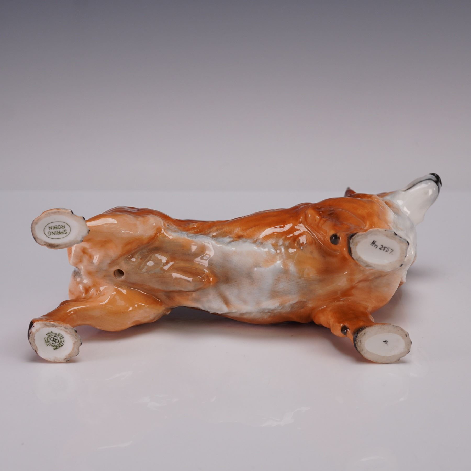 A large and rare corgi figurine. It is bone China with glossy reddish brown fur and a white underbelly. Handwritten HN number. Spring Robin backstamp. Royal Doulton backstamp.