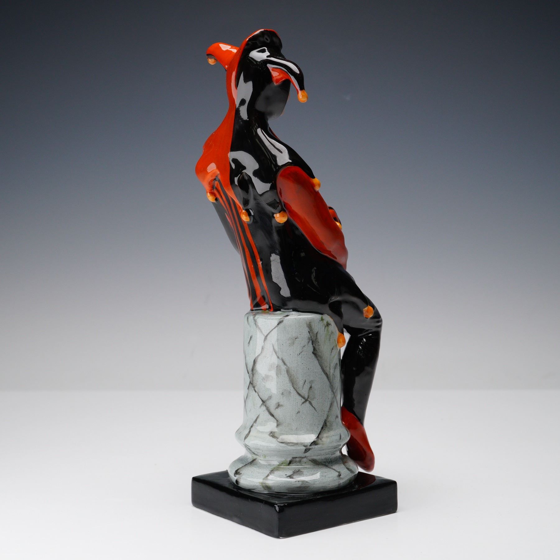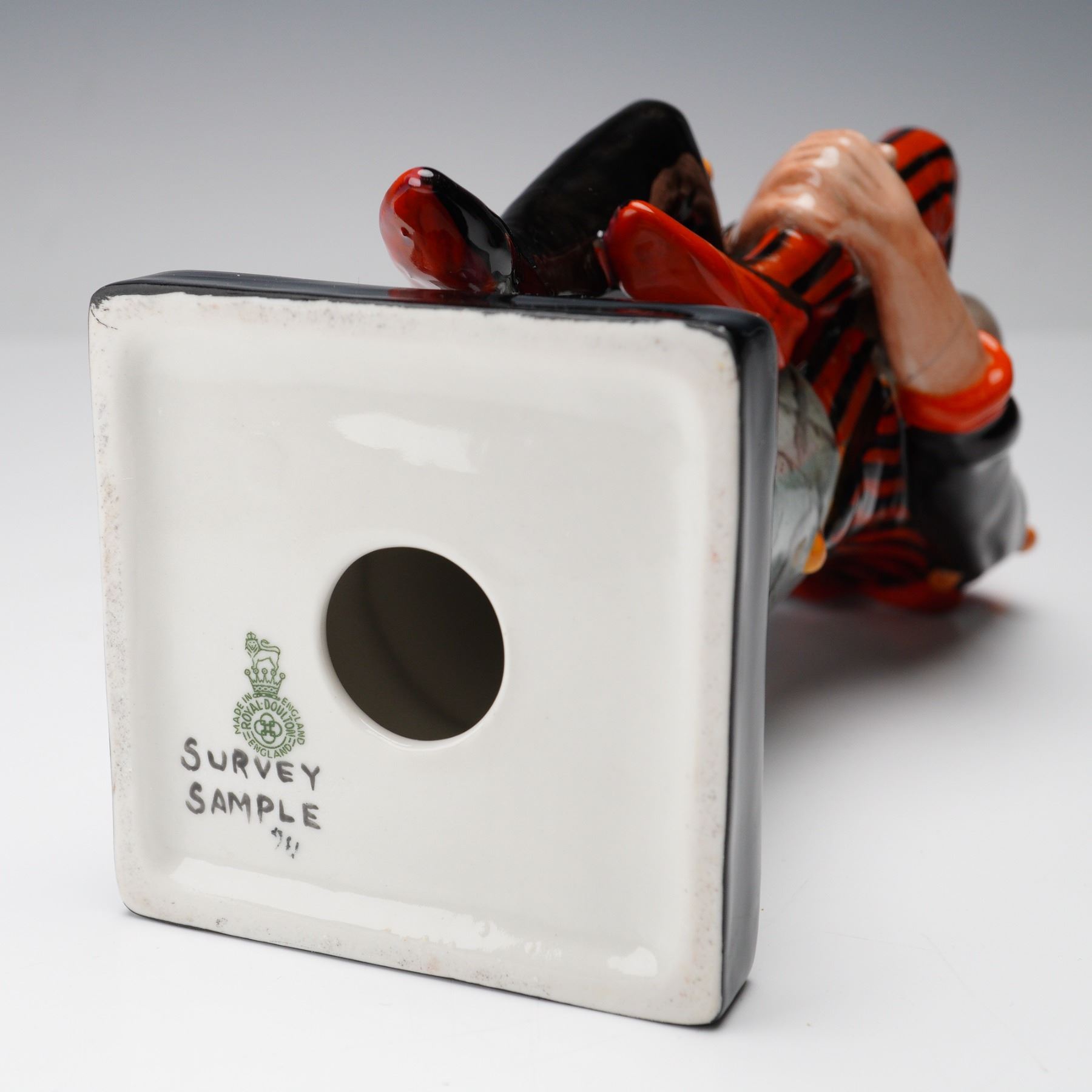 Rare Royal Doulton figurine depicting The Jester, finished in vibrant red and black costume with striped trousers and jaunty hat, standing upon a marbled plinth. This early production piece bears the Royal Doulton backstamp and is marked Survey Sample beneath, indicating it was used for design or glaze evaluation prior to general release. A highly collectible prototype example of this classic figure. Royal Doulton backstamp.