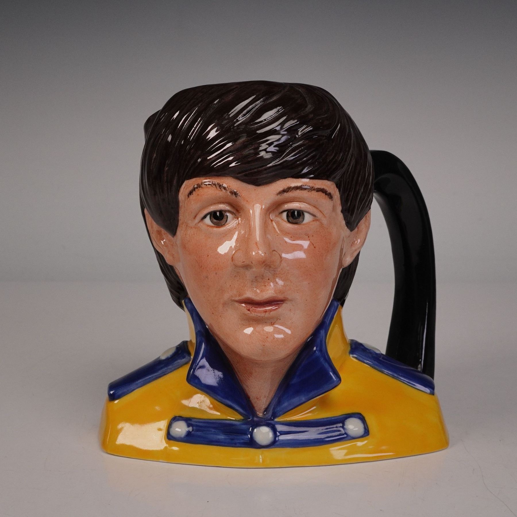 A finely crafted ceramic character jug depicting musician Paul McCartney, produced as part of The Beatles collection. The piece portrays McCartney in a vivid yellow and blue uniform inspired by the iconic Sgt. Pepper's Lonely Hearts Club Band era, with intricate hand-painted facial features and dark brown hair forming the jug's handle. The underside bears the Royal Doulton hallmark along with printed identification details, including the series title and model number.