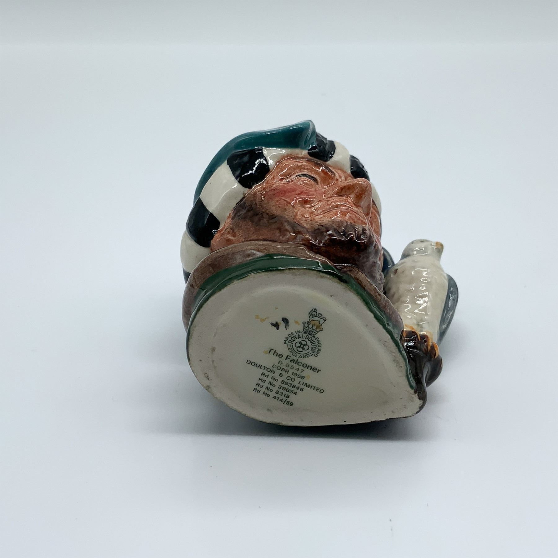 This is a Royal Doulton mini character jug titled The Falconer, model number D6547. The jug features a finely detailed depiction of a medieval falconer wearing a striped cap, with a falcon perched on his hand forming the handle. The underside bears the Royal Doulton backstamp along with the model details.