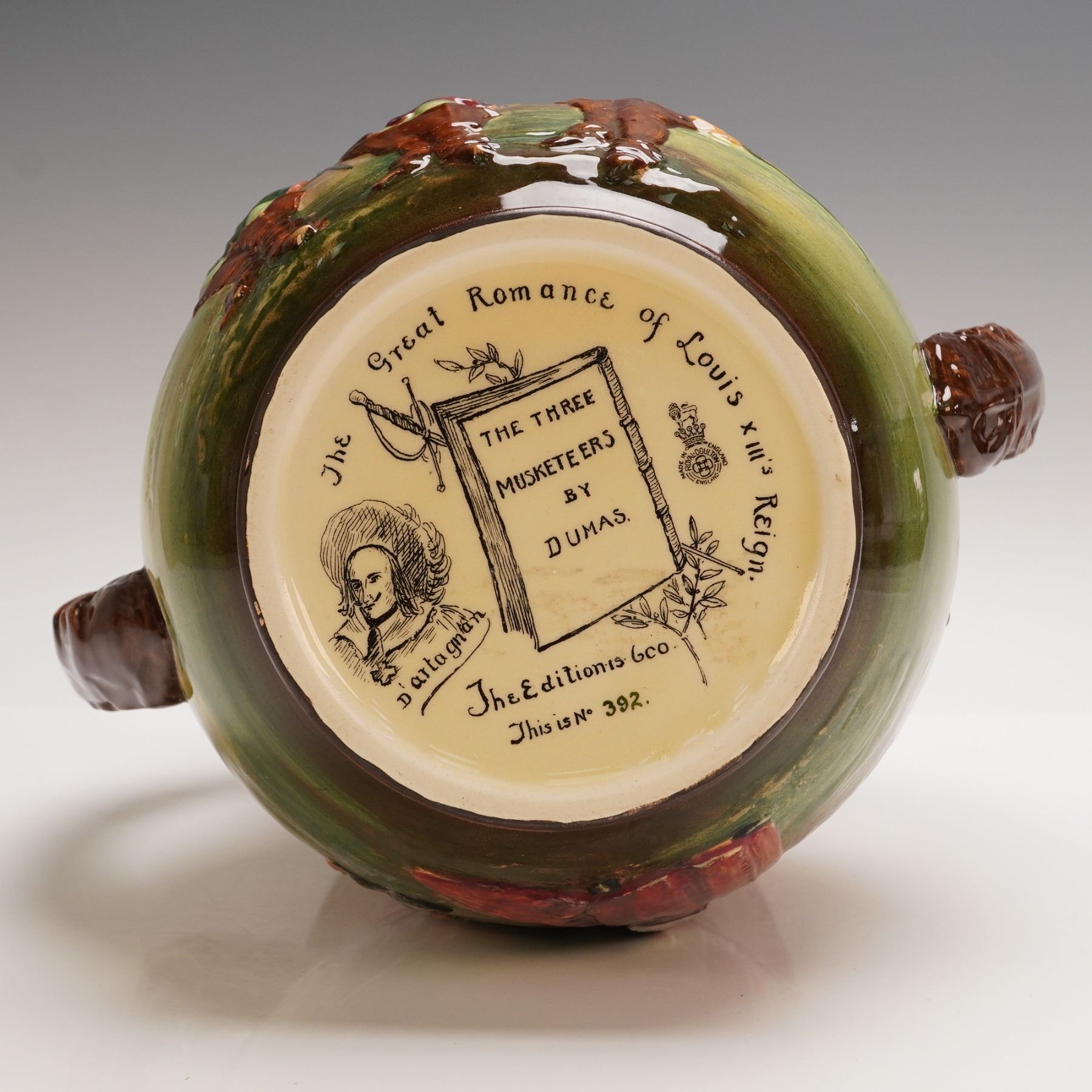 A limited edition Royal Doulton ceramic jug commemorating The Three Musketeers by Alexandre Dumas, intricately modeled and vividly hand-painted in bas-relief. This large two-handled jug celebrates "The Great Romance of Louis XIII's Reign," featuring the iconic figures of Athos, Porthos, and Aramis on one side, with Cardinal Richelieu and street scenes on the reverse. Sculpted detail extends to the braided handles and architectural motifs above the figural scenes. The base is inscribed with the jug's literary theme and book title, and marked with the Royal Doulton backstamp. Limited to an edition of 600, this is number 392, signed Noke.