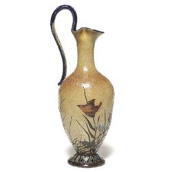 Good Royal Doulton ewer, elaborate design of birds and flowers, marked, artist initials, 12.75”h