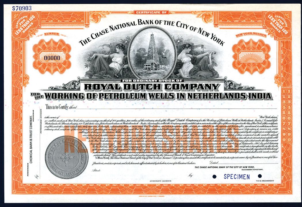 Netherlands-India. 1918, <100 Shares, Specimen stock certificate, "Certificate of the Chase national Bank of the City of New York". POC's, XF. Scarce location. ABNC.
