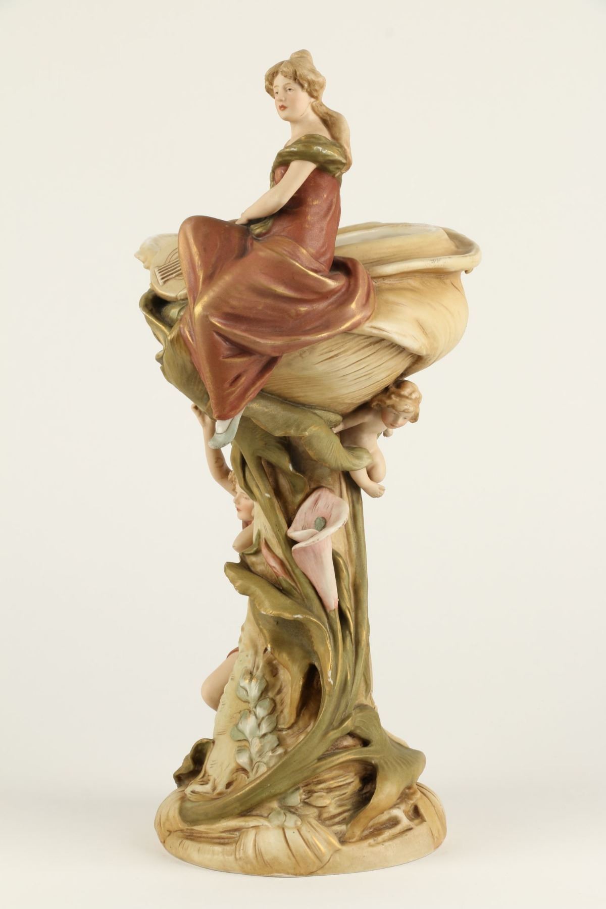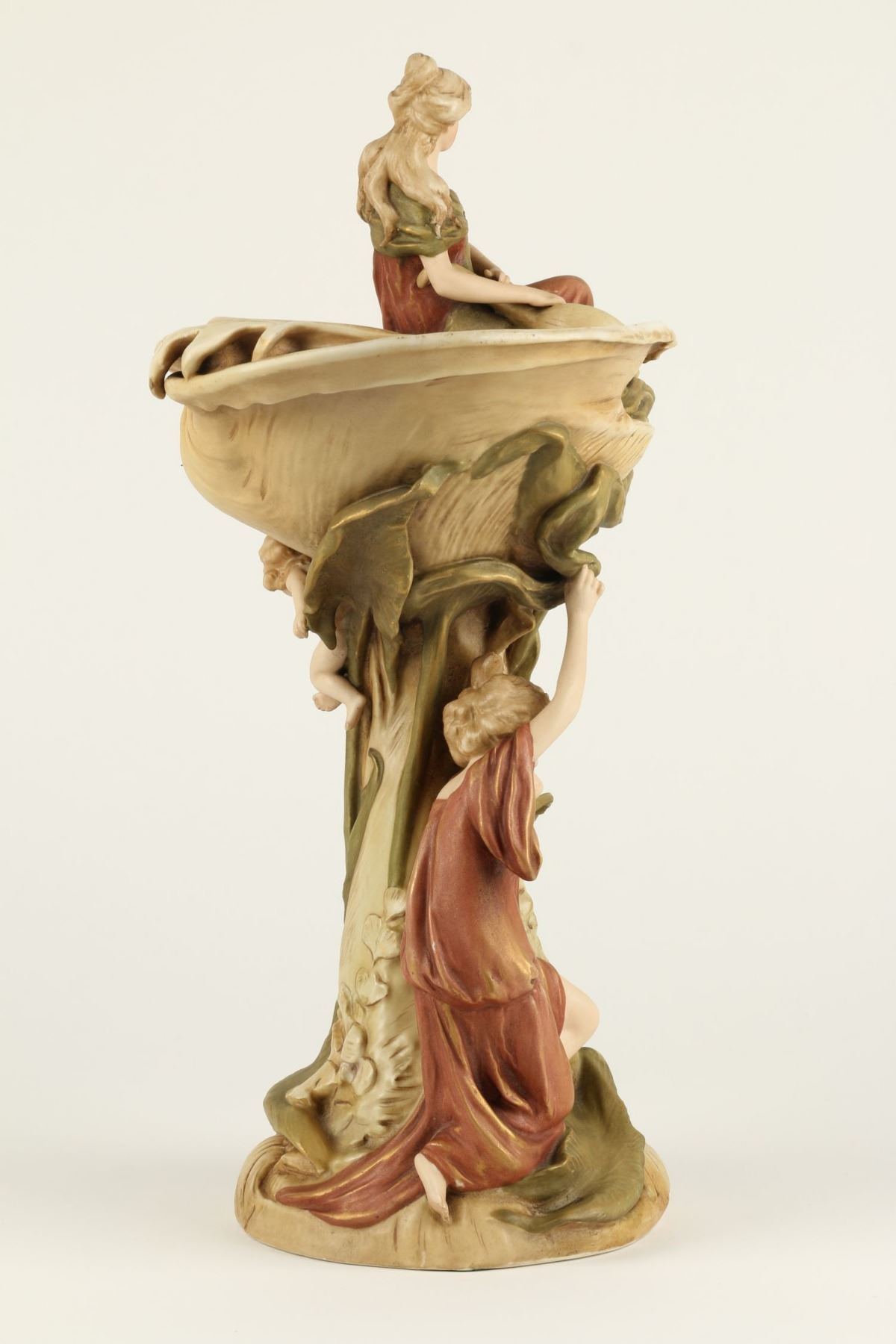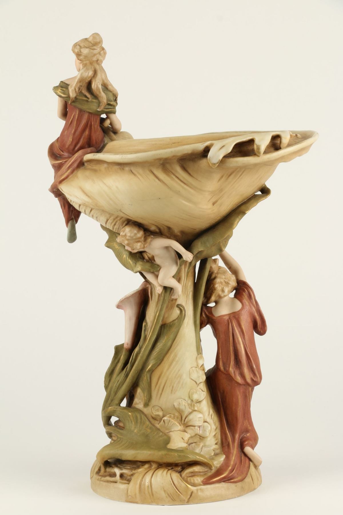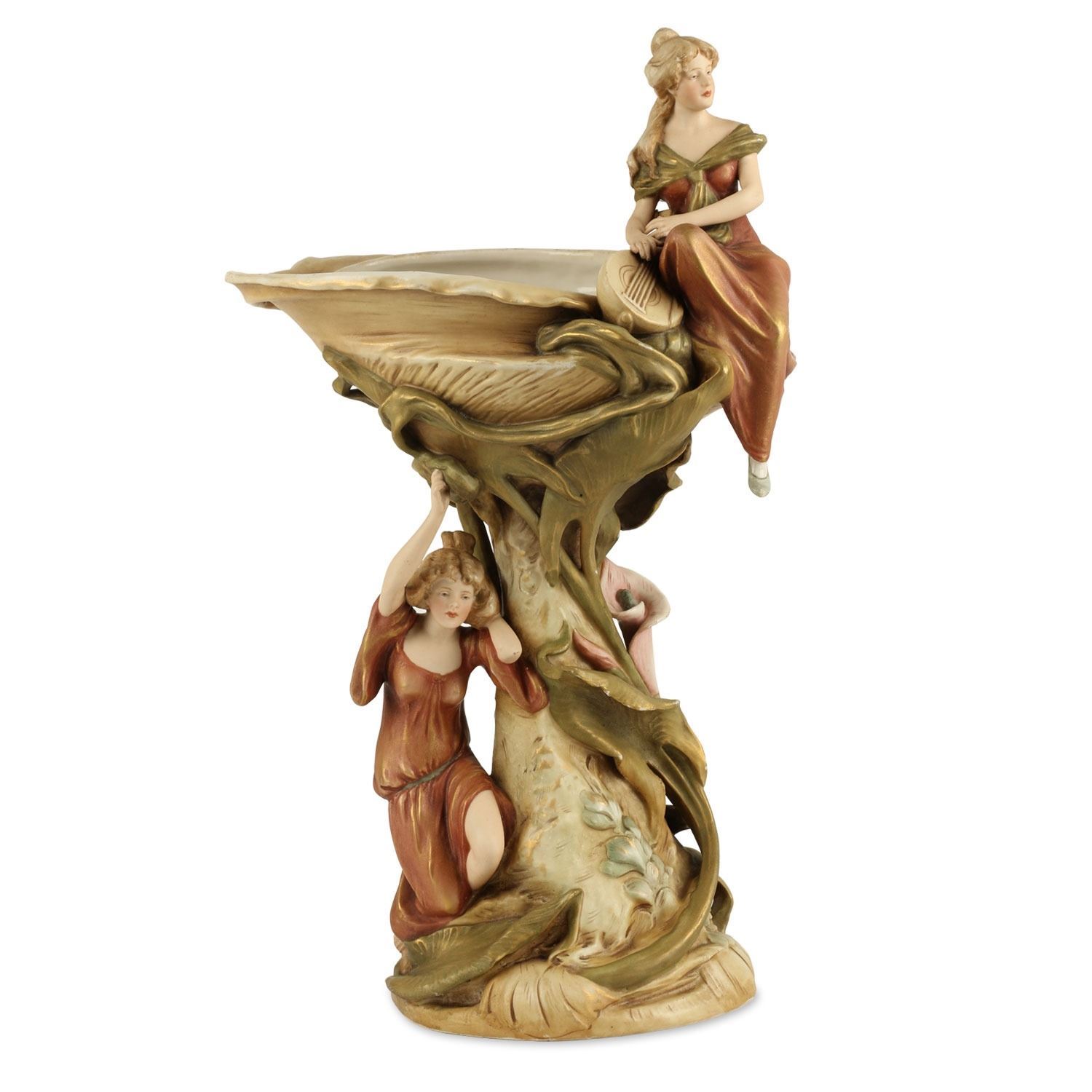 Lot 225 - Pottery featuring two ladies and one child at rear. Marked, "Royal Dux Bohemia 1730" on base. Minor edge chips along the tips of the leaves. 16.5" x 11" x 6". $400-650.