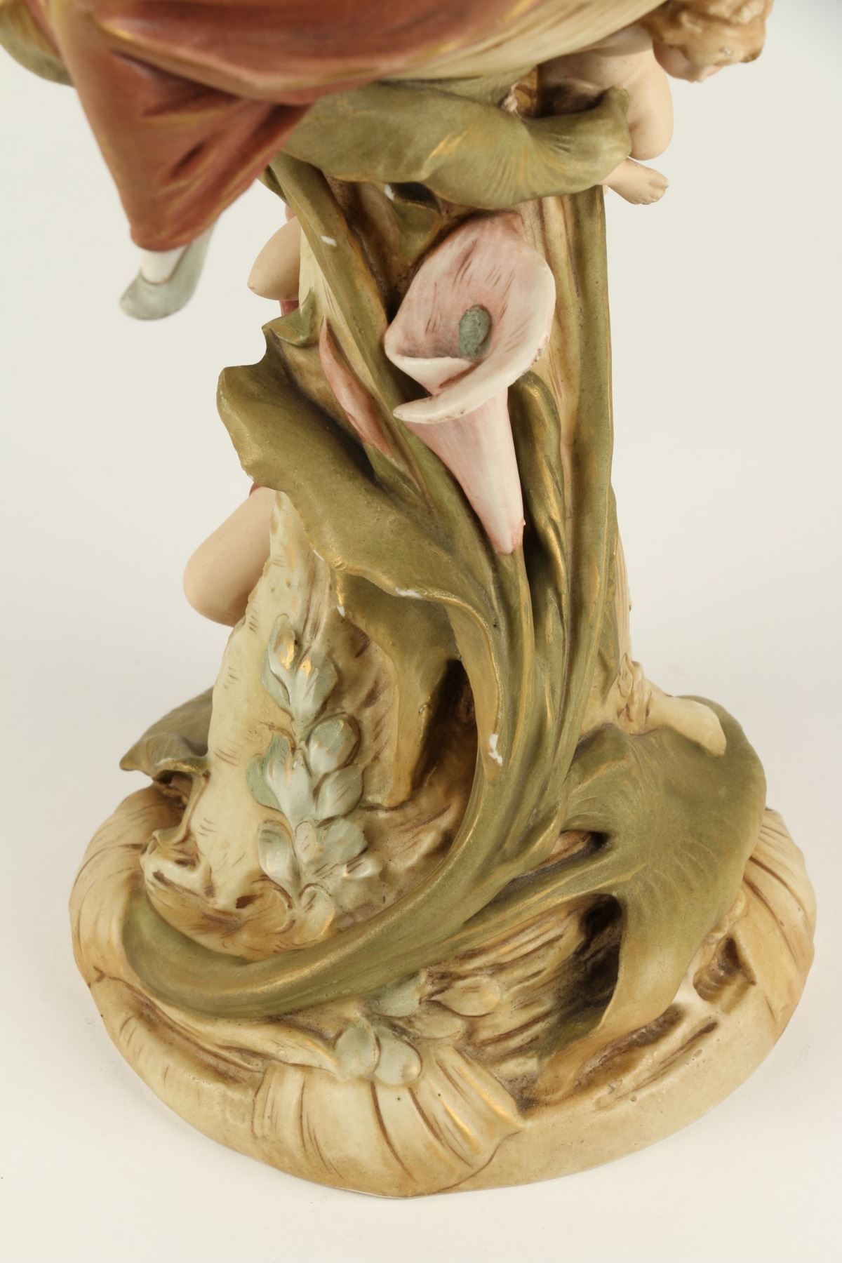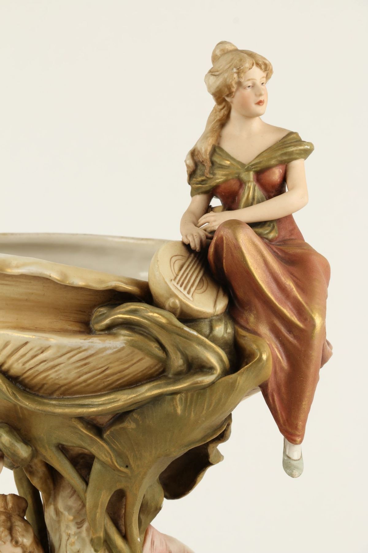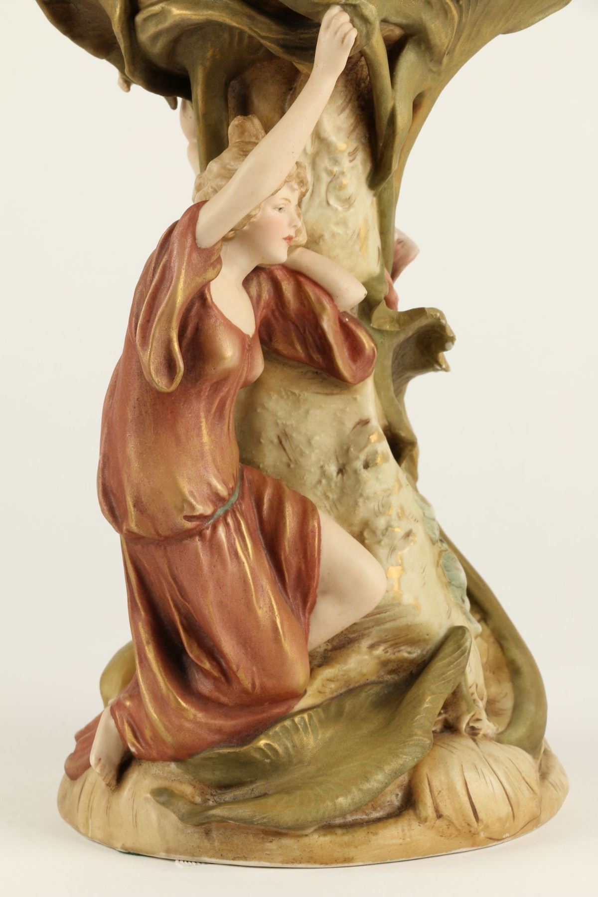 Lot 225 - Pottery featuring two ladies and one child at rear. Marked, "Royal Dux Bohemia 1730" on base. Minor edge chips along the tips of the leaves. 16.5" x 11" x 6". $400-650.