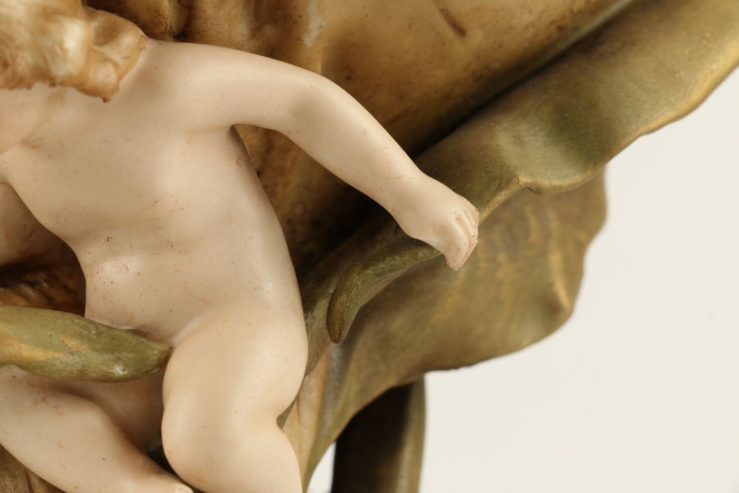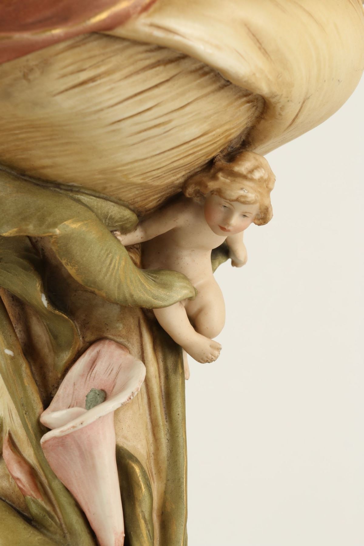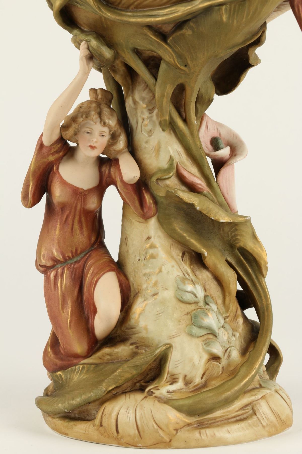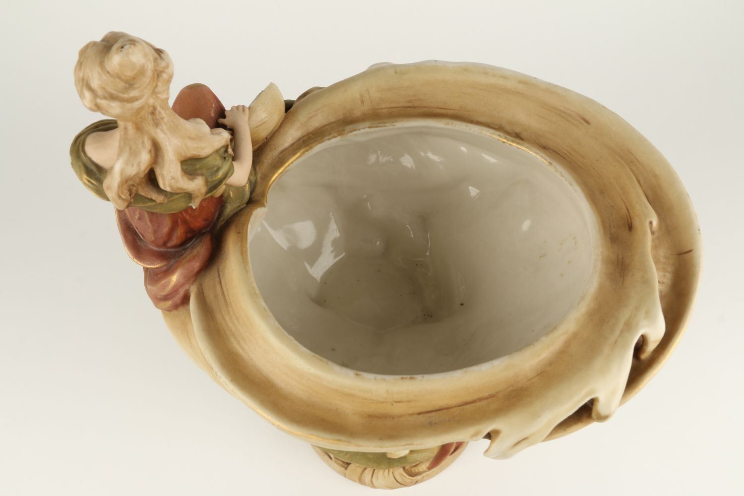 Lot 225 - Pottery featuring two ladies and one child at rear. Marked, "Royal Dux Bohemia 1730" on base. Minor edge chips along the tips of the leaves. 16.5" x 11" x 6". $400-650.