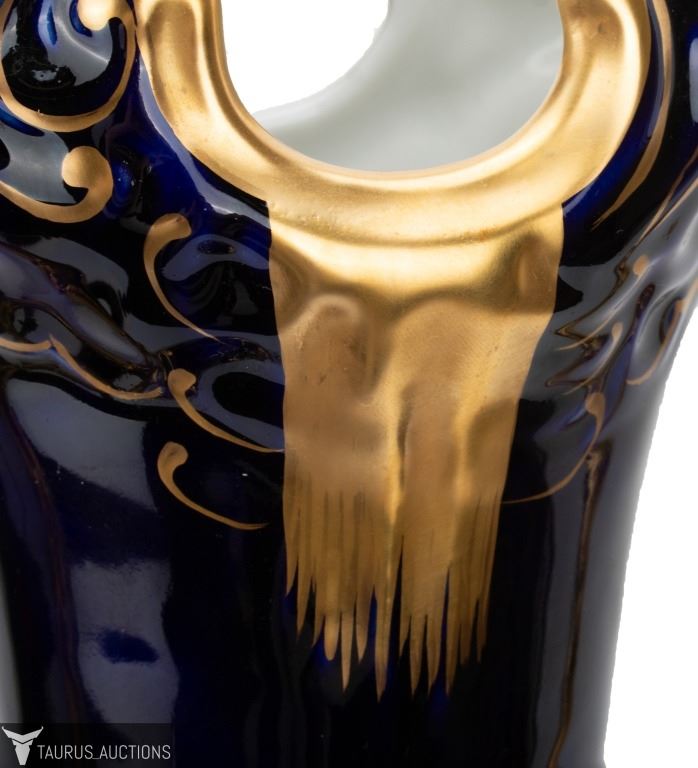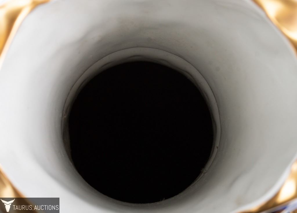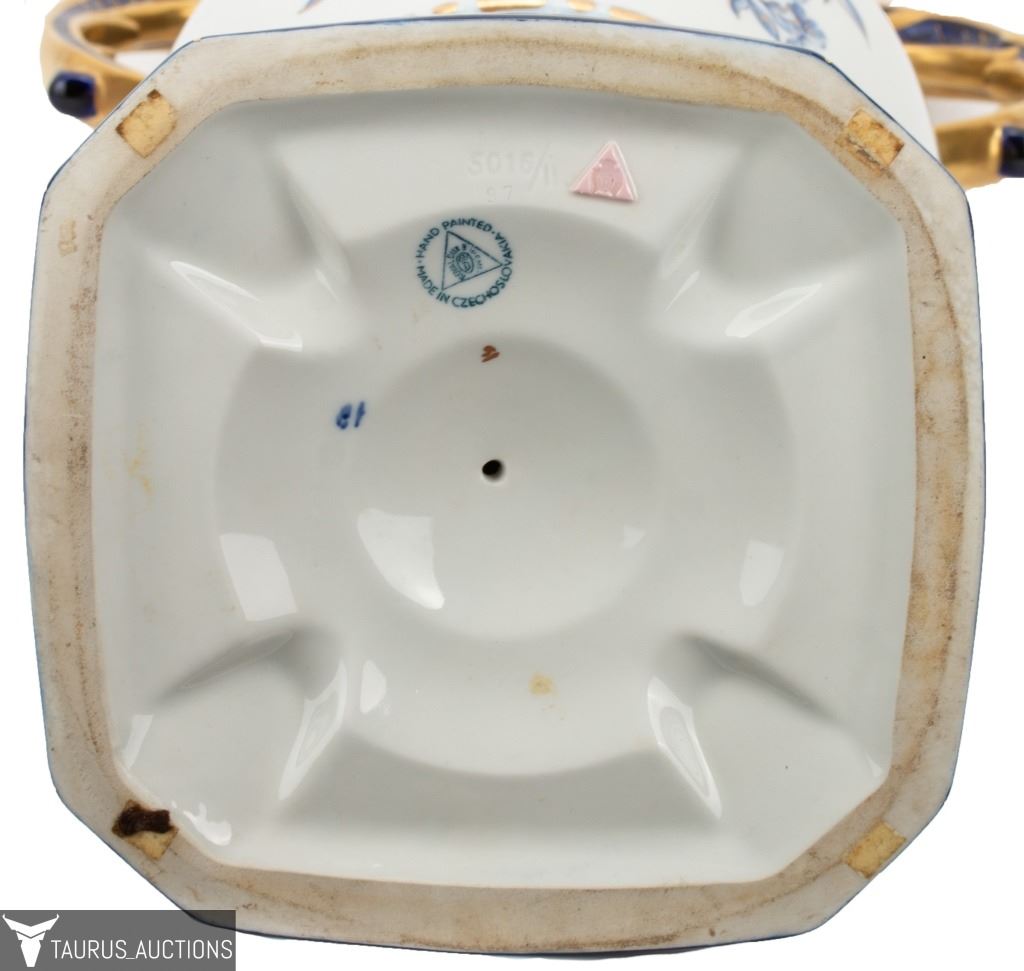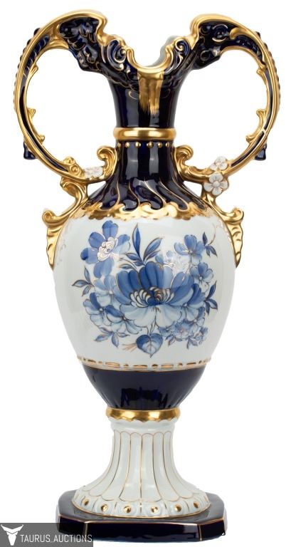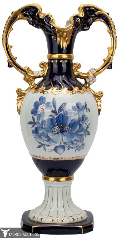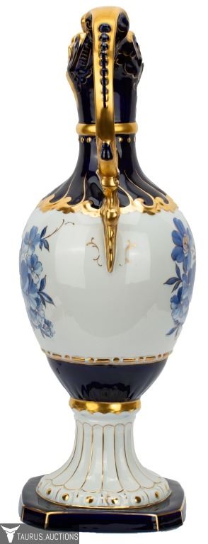 Item/Description: Large porcelain Royal Dux Bohemia vase. A porcelain amphora-form handled vase with hand-painted cobalt and gilt decoration on a white ground. Floral motif decoration, octagonal base. Marked with glazed pink triangle, blue Royal Dux Czechoslovakia stamped mark, impressed 5016/11 and 97.