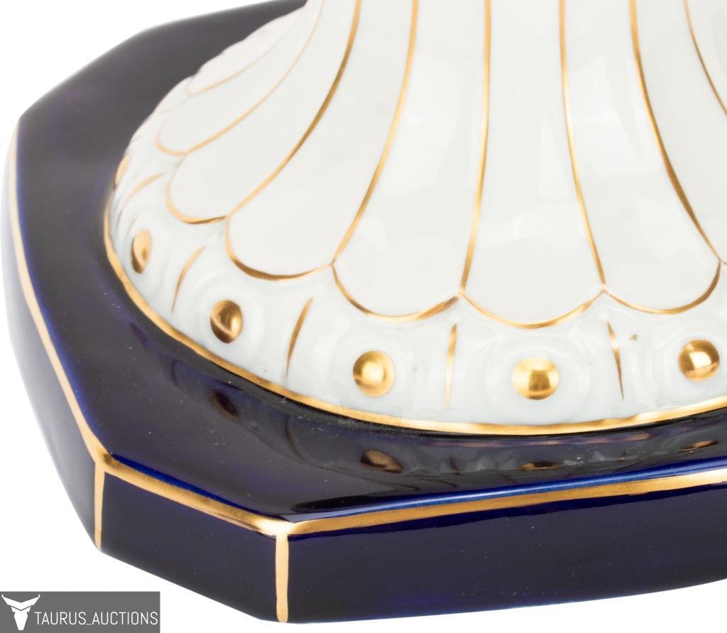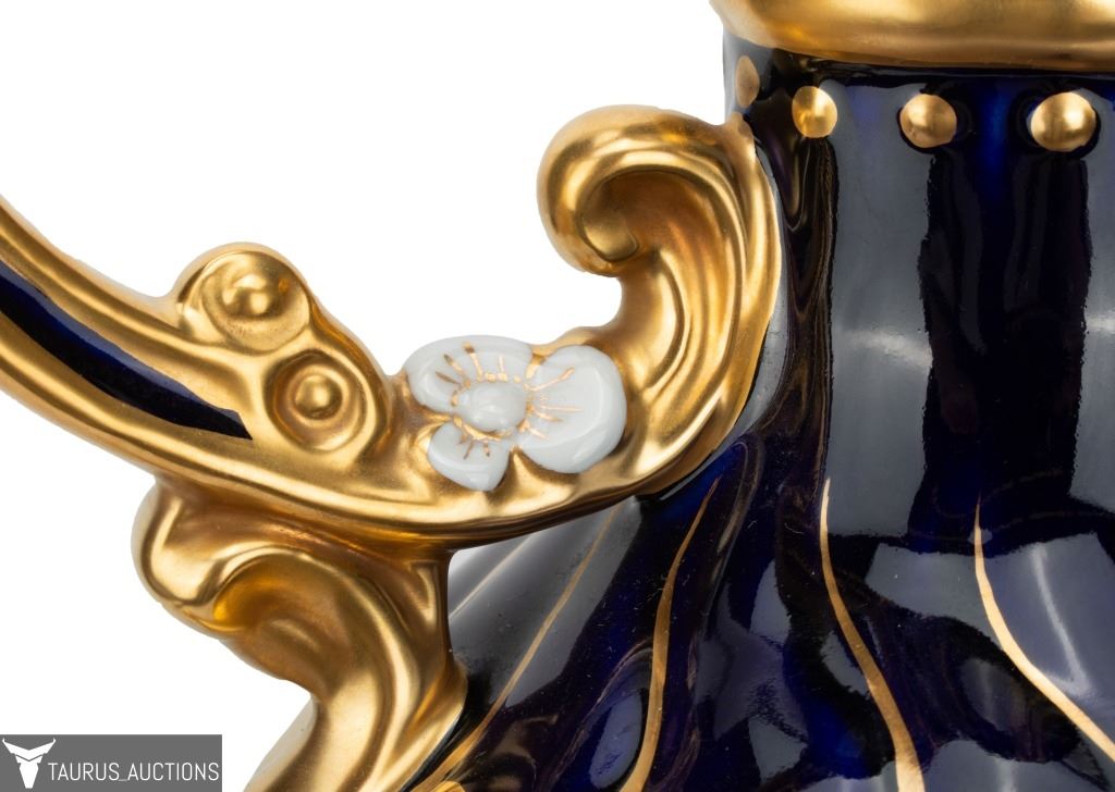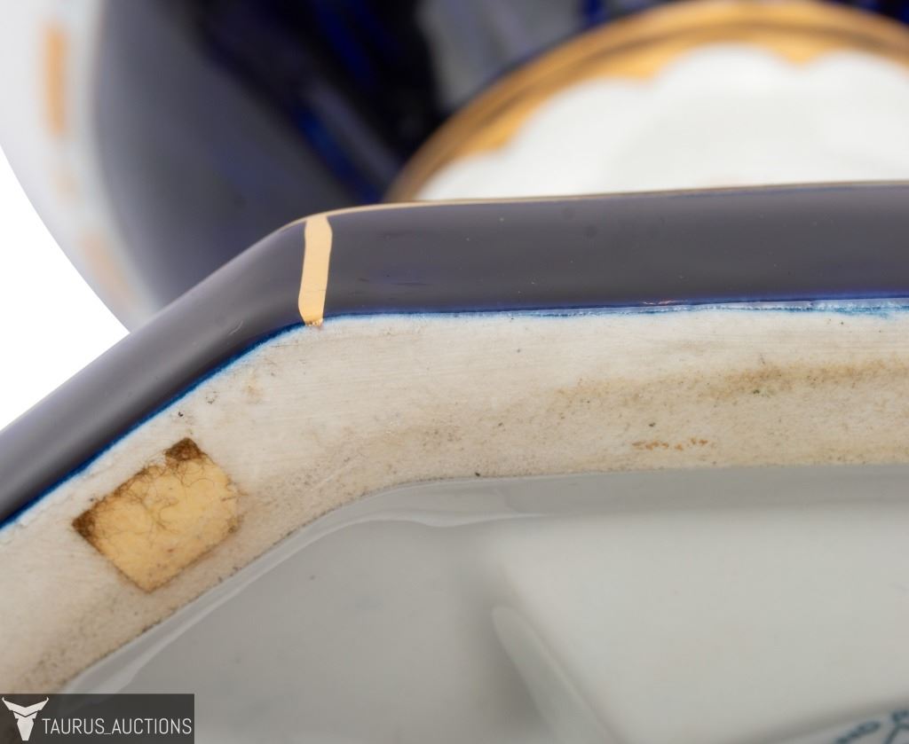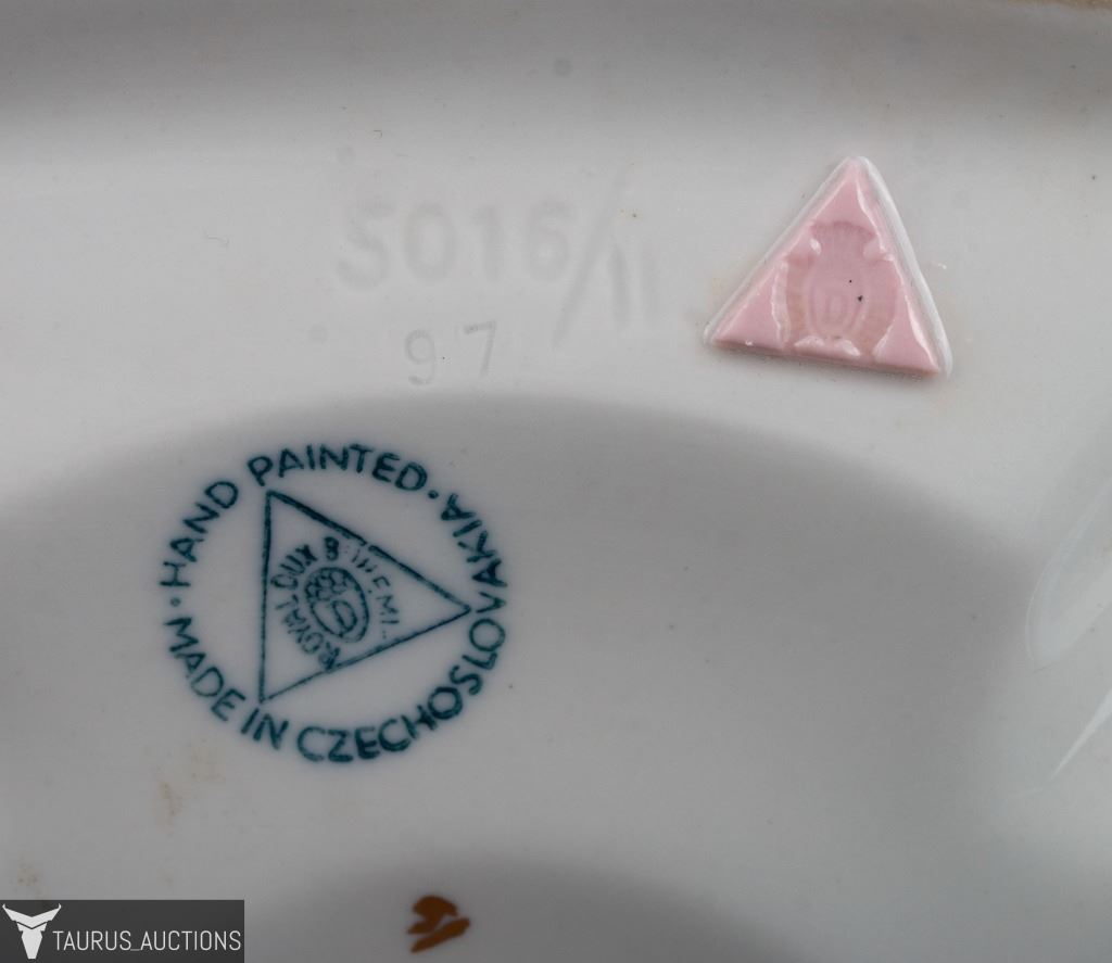Item/Description: Large porcelain Royal Dux Bohemia vase. A porcelain amphora-form handled vase with hand-painted cobalt and gilt decoration on a white ground. Floral motif decoration, octagonal base. Marked with glazed pink triangle, blue Royal Dux Czechoslovakia stamped mark, impressed 5016/11 and 97.