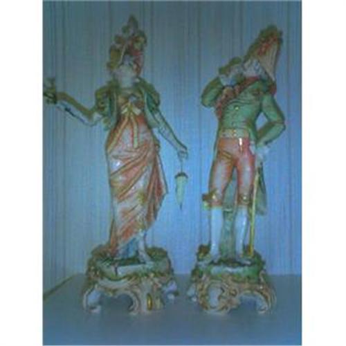A pair of Royal Dux. Small repair to the man, the lady is perfect, in bisk and glaze. The figures have their original accoutrements. They number 22 and 121 and the man has the applied red triangle with the letter "F". 19th century