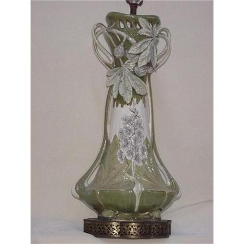 A Royal Dux art nouveau vase mounted as a lamp, 20" tall vase with glaze finish having tendril branches and leaves in full relief. Beautiful shades of green with a spray of blue flowers all with gold highlights. Mounted on a brass base probably in the 1930's, and as shown, to drill for the pipe they drilled right through the mark. Condition, very good, for its age. Roughly 100 years there is not a chip on it.