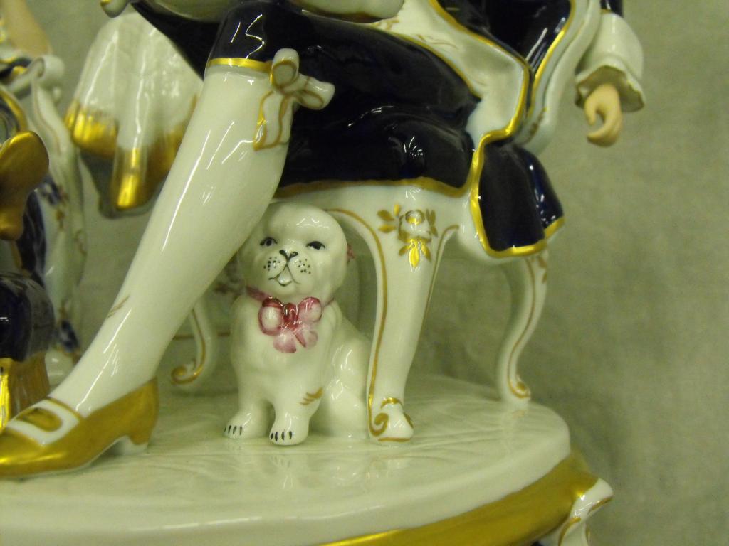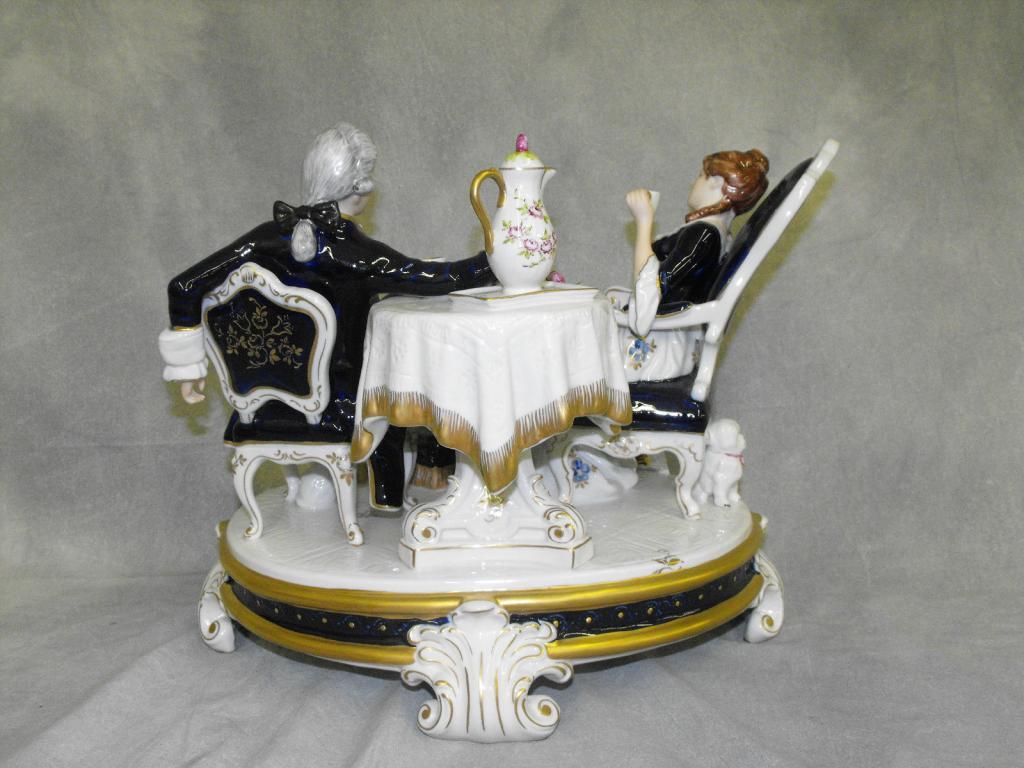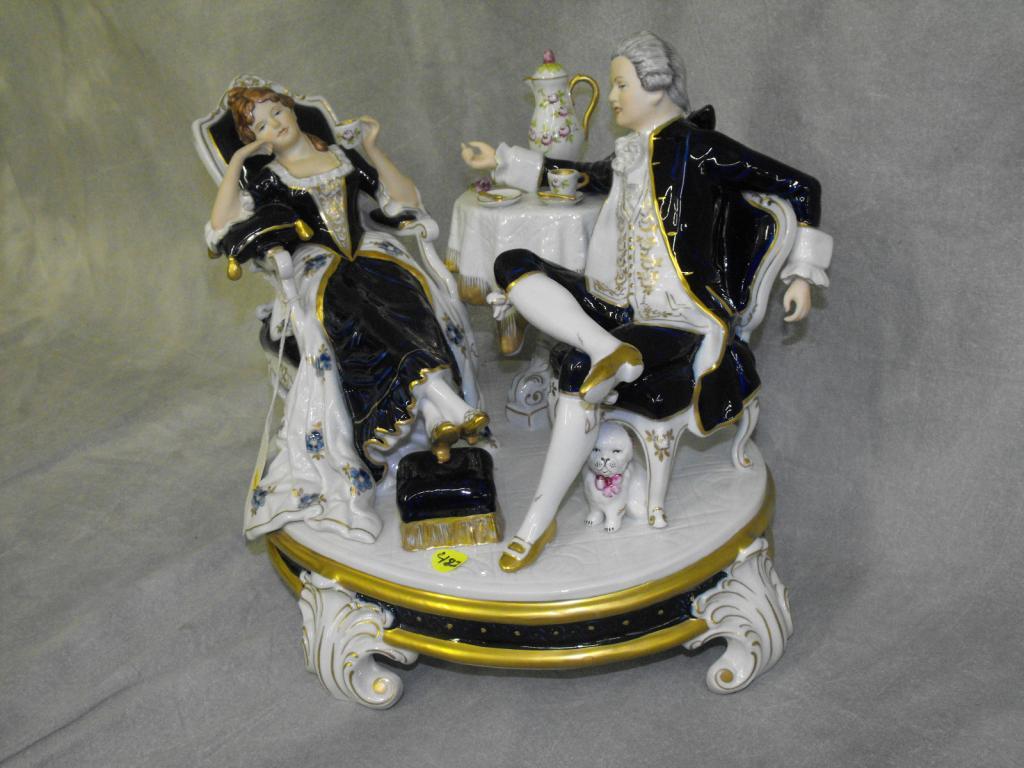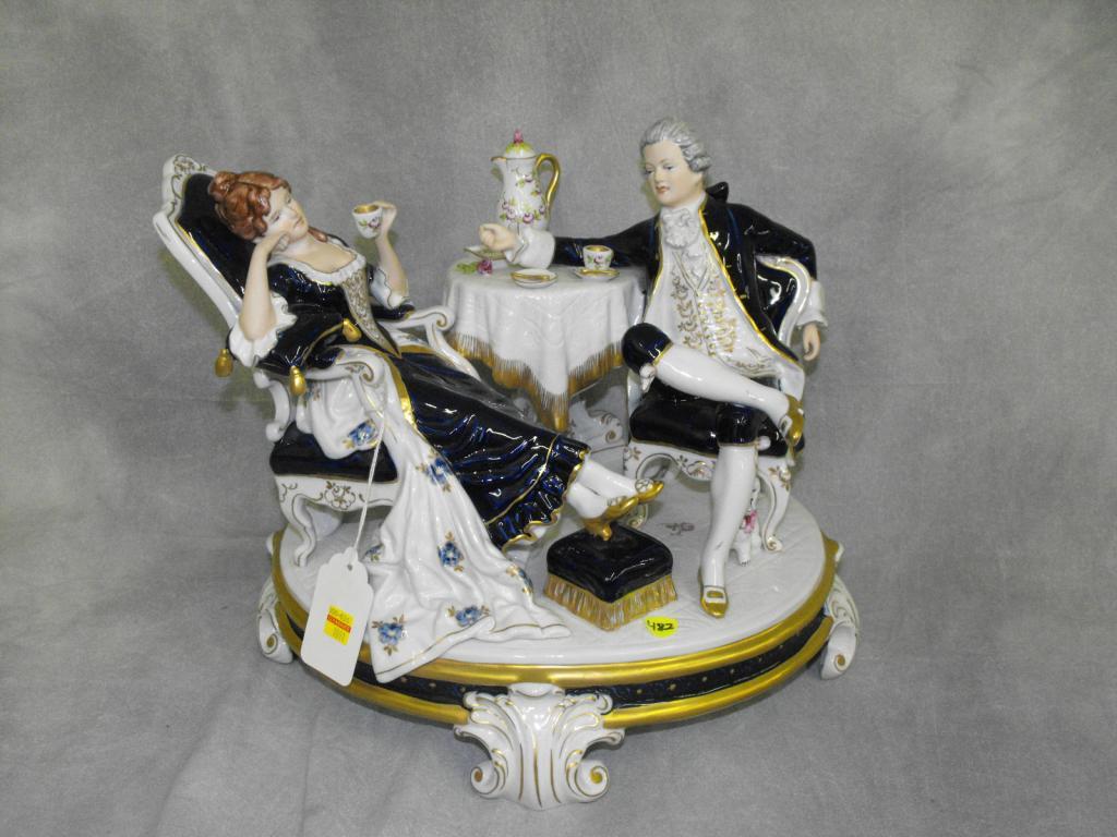 Beautiful large Royal Dux figural group of Palatial Tea Party circa 1930's with pink triangle and blue hallmark for Royal Dux. It is a young man and woman dressed in lavish regal country attire having tea. Louis XV style furniture and