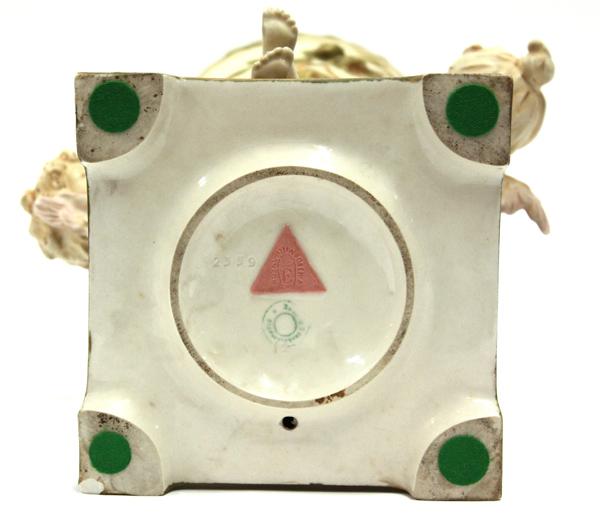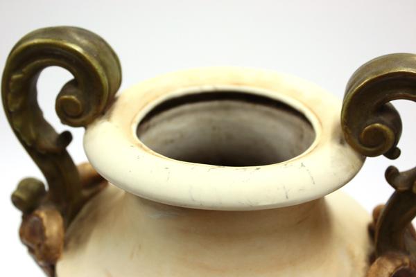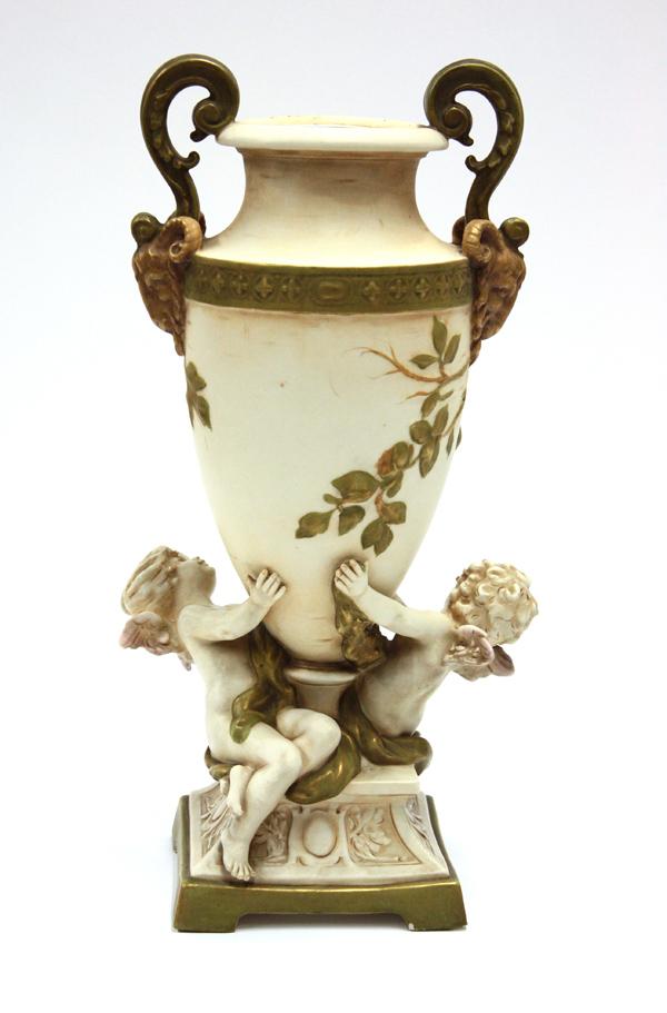 Royal Dux figural centerpiece, the shouldered form with handles terminating on ram's head mounts above a tapering body decorated with floral sprays and supported by winged putti rising on a square footed plinth, marked Royal Dux Bohemia on base, 18''h x 9''w