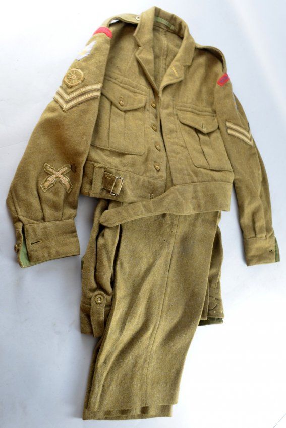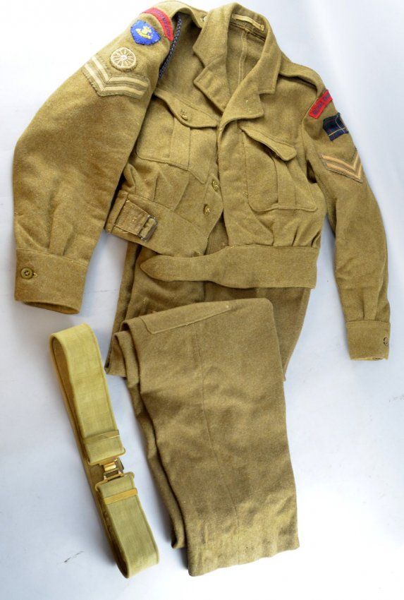 Royal Engineers, two battle dress uniforms with sleeve badges 1949 pattern canvas belt and a No 1 dress uniform and cap with badge by Compton & Sons