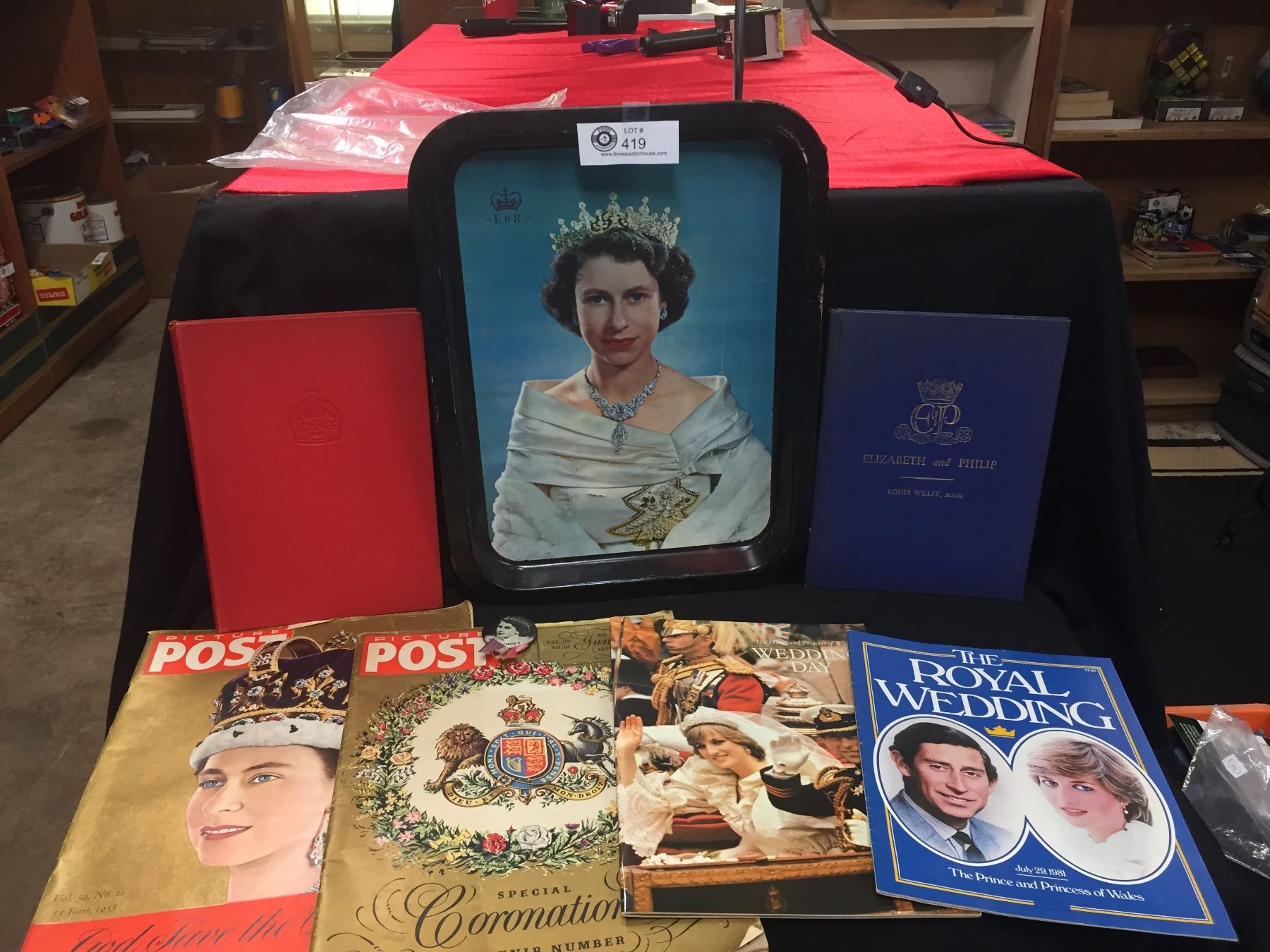 Royal Family Collectible Lot. Queen Elizabeth on a Train, Queen Elizabeth Magazine Picture Post of her Coronations, Plus The Royal Wedding Books. Nice Lot.