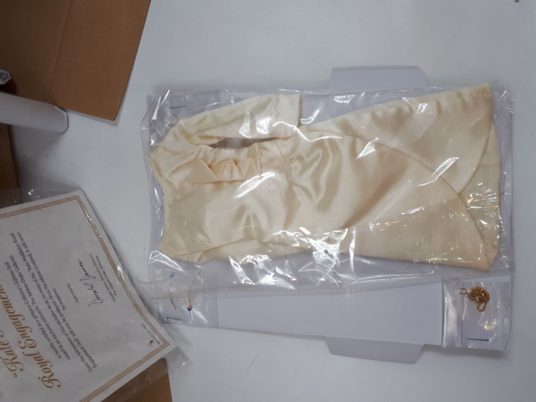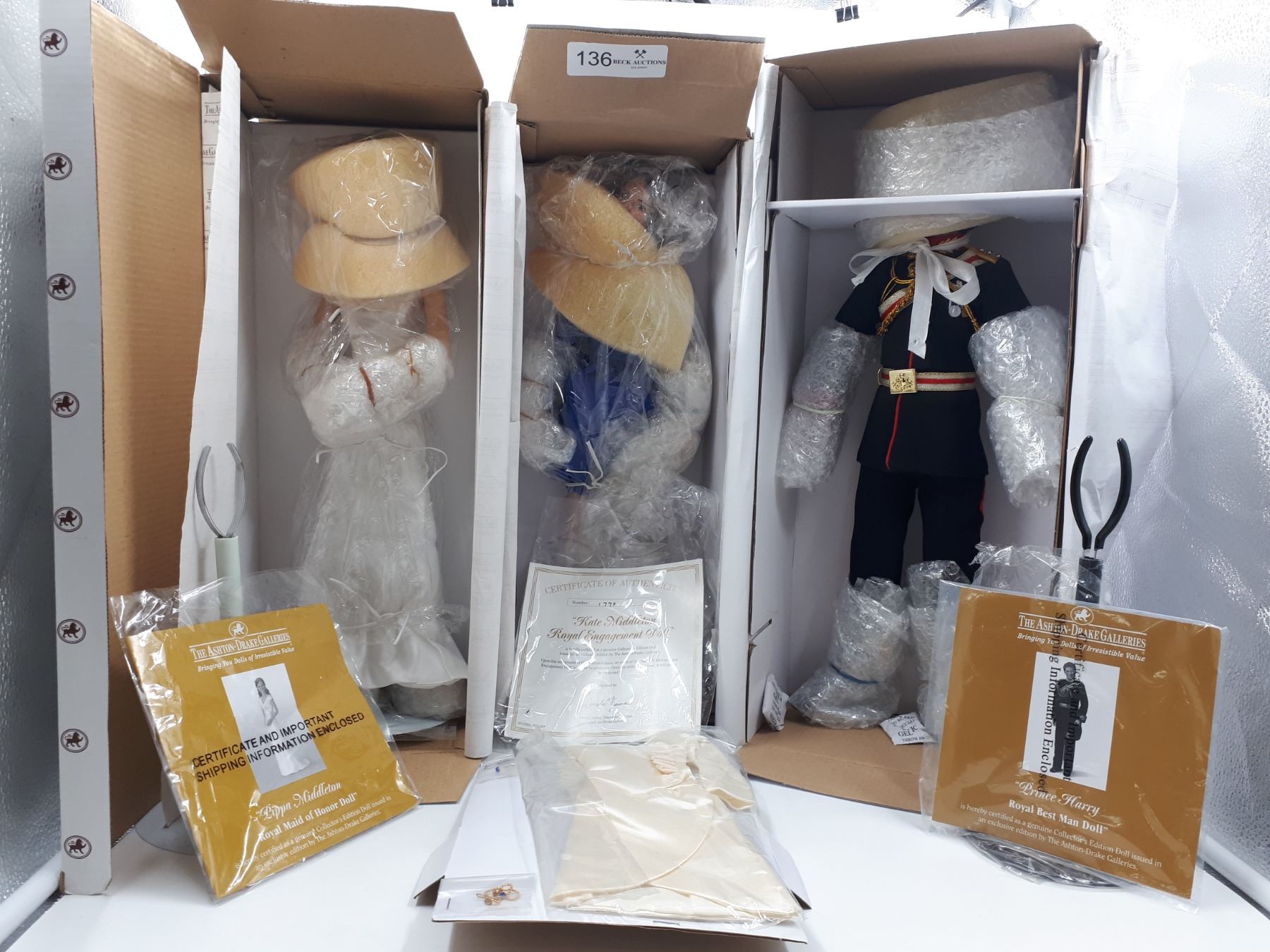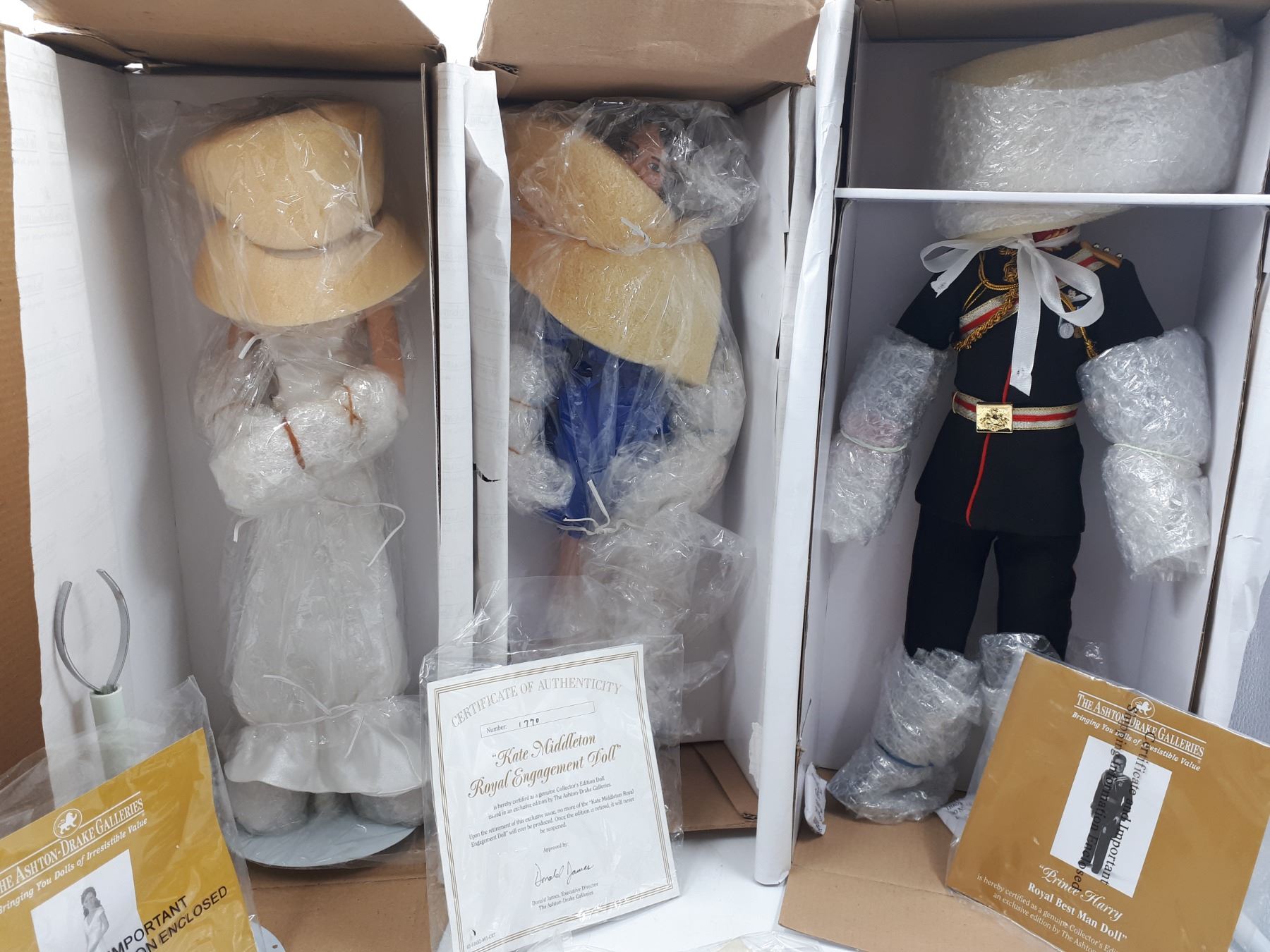 Three members of the royal family dolls including Pippa, Kate and Harry. All have never been taken out of box. They measure approx 16 - 1/2 inches tall. Each includes a stand and certificate.