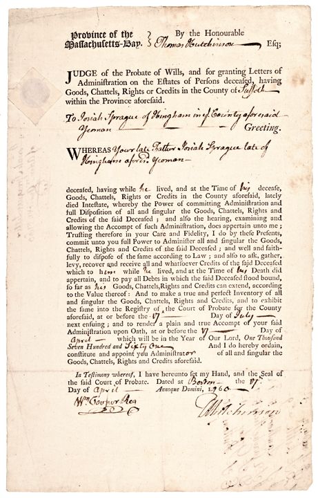 April 7, 1760-Dated French and Indian War period, Partially-Printed Document Signed “Tho(mas) Hutchinson,” Province of Massachusetts Bay, Boston, Extremely Fine. This boldly printed original Document measures 12.25” x 7.75” and is beautifully printed on fine laid period paper. It is fresh and clean, amazingly having significant amounts of original press text embossing from the printing press still seen within the paper. It is Signed by Thomas Hutchinson as the Judge of Probate of Wills, appointing Jonah Sprague as administrator of his late father’s estate and has a short list of valued goods written upon the blank reverse edge and has a docket at the top central edge. An exceptional quality document with an impressive signature.
