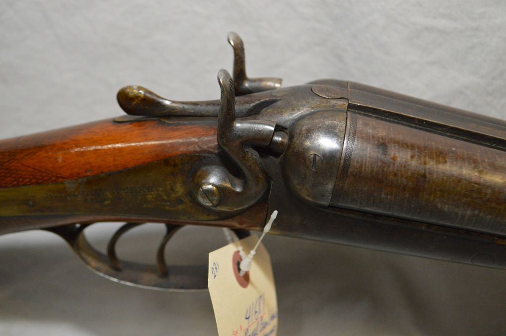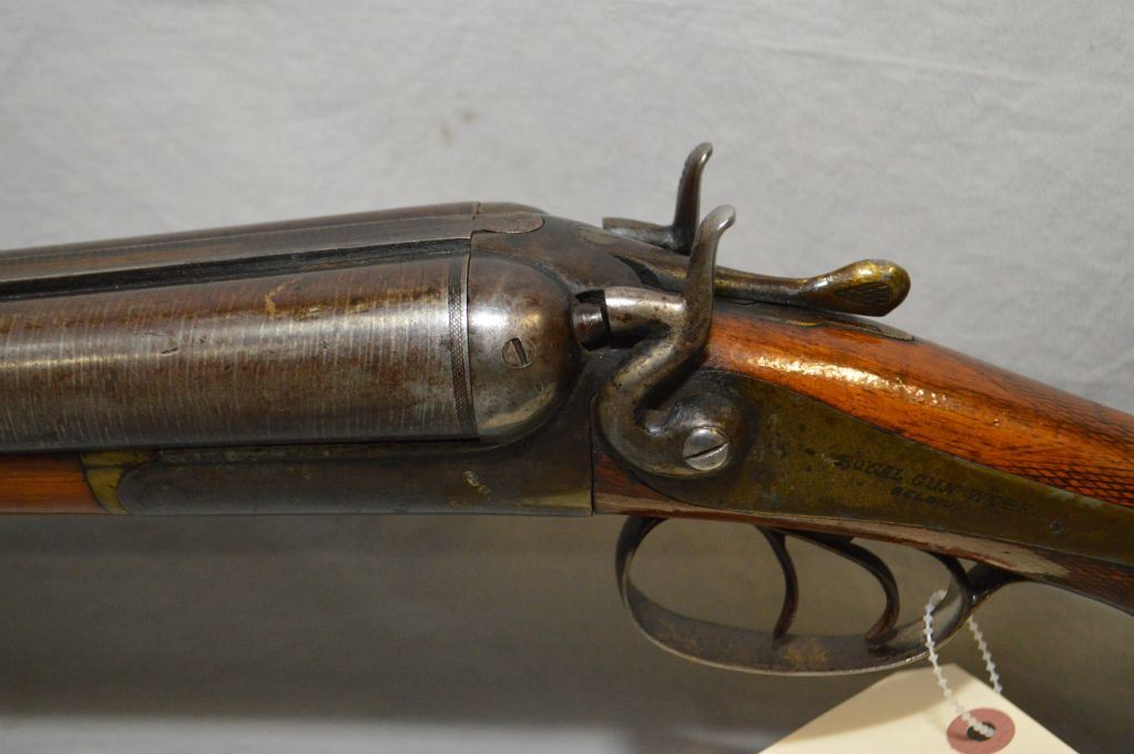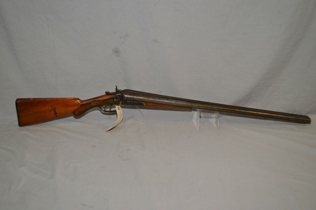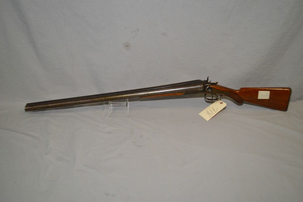 Royal Gun Works (Belgium) Model S X S Hammer, 10 ga. side by side shotgun with 29 1/2" laminated steel damascus pattern barrel [ Back action style locks, round checkered pistol grip stock and fore end, re-varnished] Serial : 41681