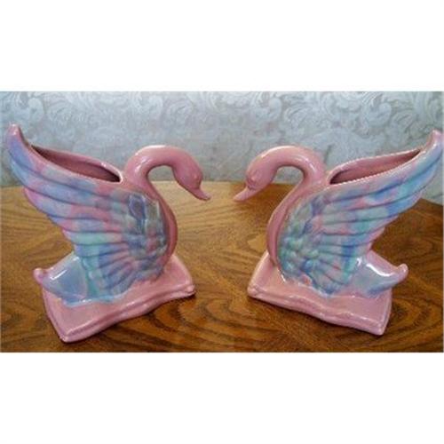 Royal Hickman for Haeger Art Pottery facing Console Swan Vases in the Mauve Agate glaze. Exceptional condition on both pieces.<p>Each swan measures 8.5 inches high with a 6.25 inch long base. Base width is 3.5 inches. Glaze is lustrous, colors mauve and blue are rich and flowing. Superb Retro styling.