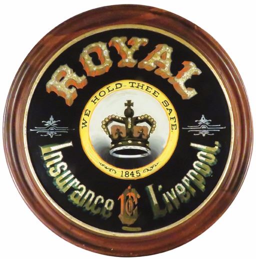 Royal Insurance Company Reverse Glass Sign, Liverpool. Entitled, "We Hold Thee Safe". Sampson Co. Cincinatti, O. maker. Comes in original walnut deep dish frame. Restoration in center and some perimeter flaking. 35 1/2 inch diameter overall.