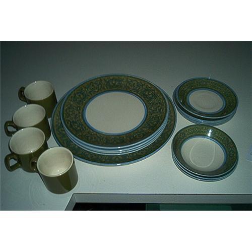 Today you will be bidding on a partial set of Royal Ironstone called, CLEAR DAY. This partial set consists of: 4-10 inch plates; 1-12 inch platter; 3-dessert bowls that measures: 5 1/2 inches in diameter, depth 3 inches; 5-6inch saucers; 4 matching coffee cups; 1 vegetable bowl (which is not pictured). Some niplets on some of the dishes but they are still in very good condition.