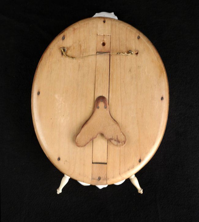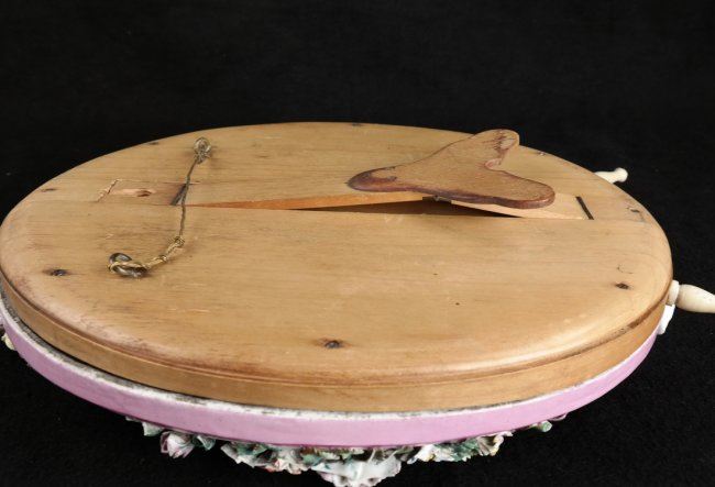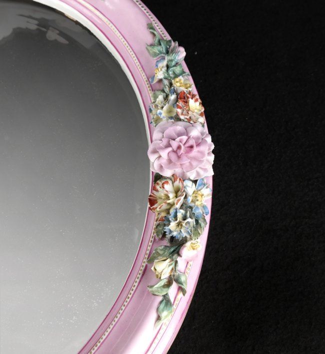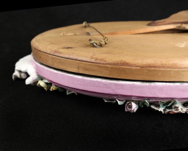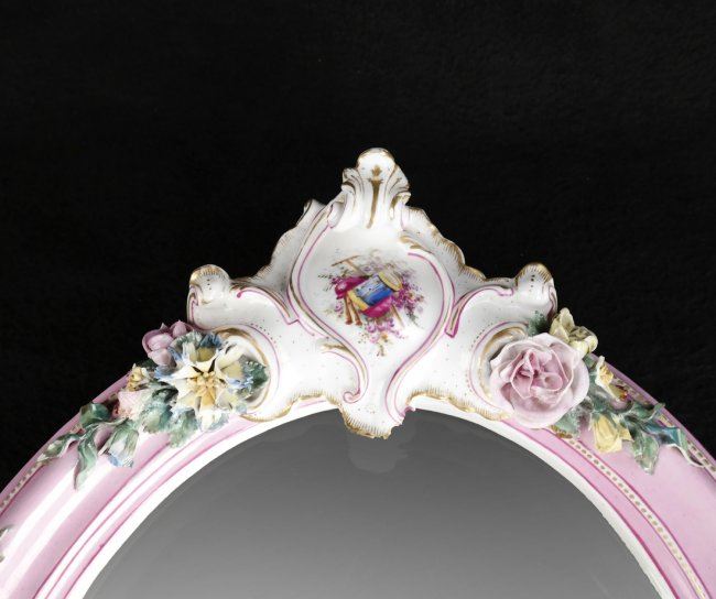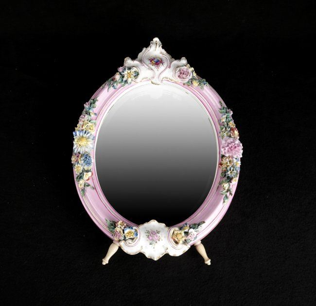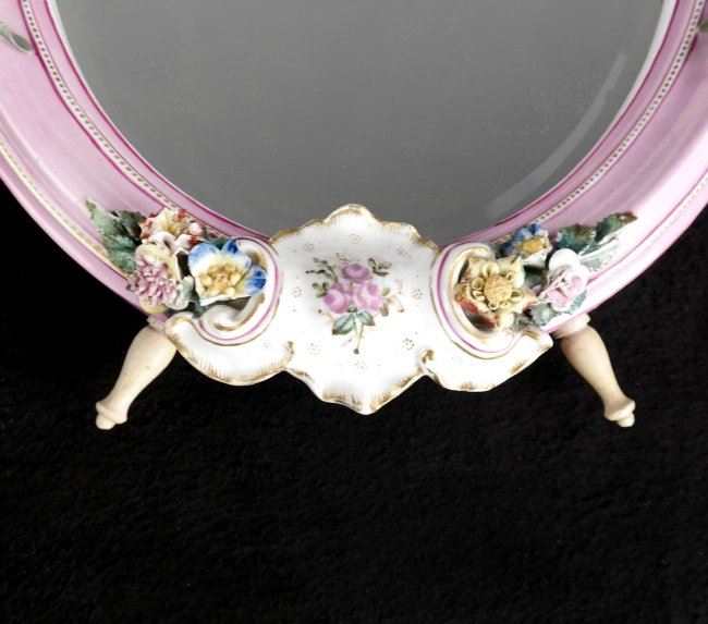 Royal KPM porcelain oval vanity/table mirror featuring hand-painted porcelain and wooden easel. [15 1/2" H x 11 1/2" W x 2" D]. Losses to porcelain flower on left side, losses to other petals.