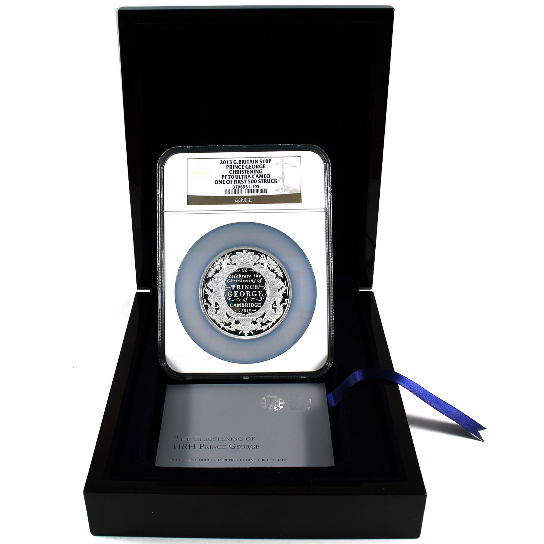 Royal Mint Issue: 2013 Great Britain Silver 10 Pound 5oz Prince George Christening NGC PF-70 Ultra Cameo. One of First 500 Struck Inside Deluxe Display Box with Royal Mint COA #123 (light toning spots).  TAX Exempt