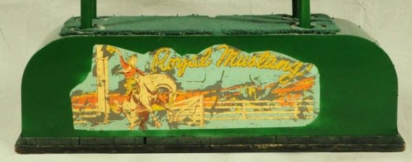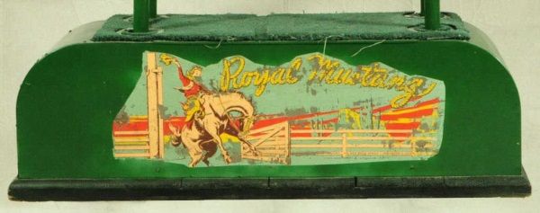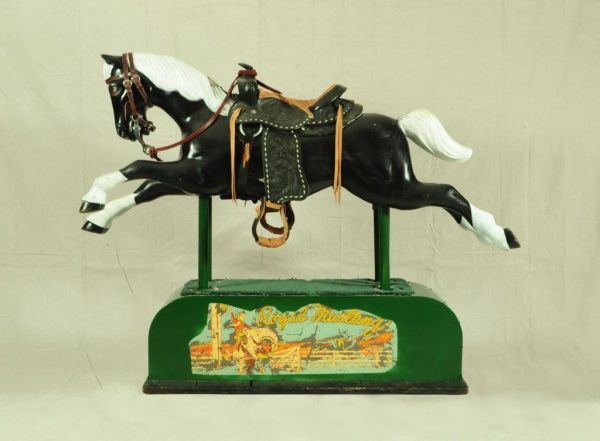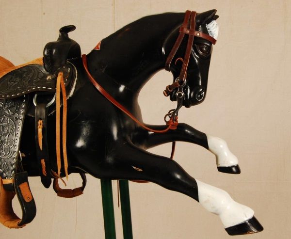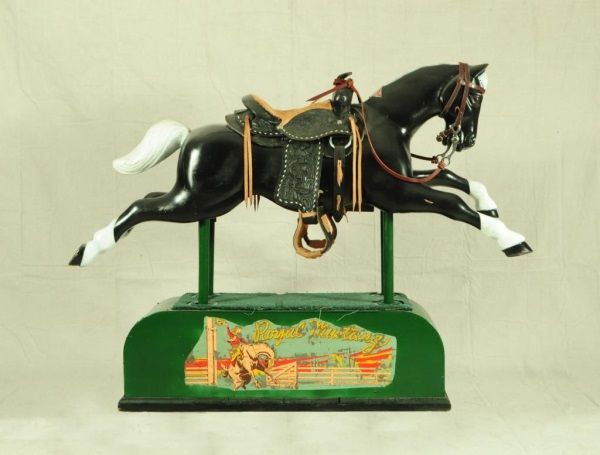Solid carved wood coin op horse Measures 54" tall, 68" long, 16" wide.