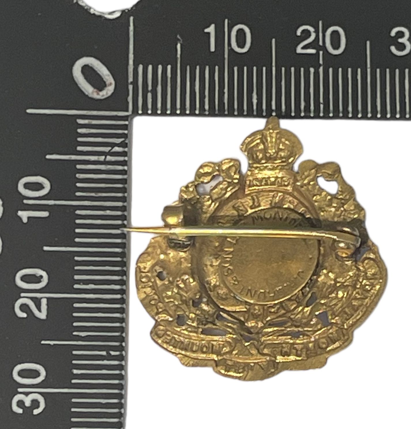 RNWMP. Gilted brass metal, with Pin fastener. Makers disk on the back.