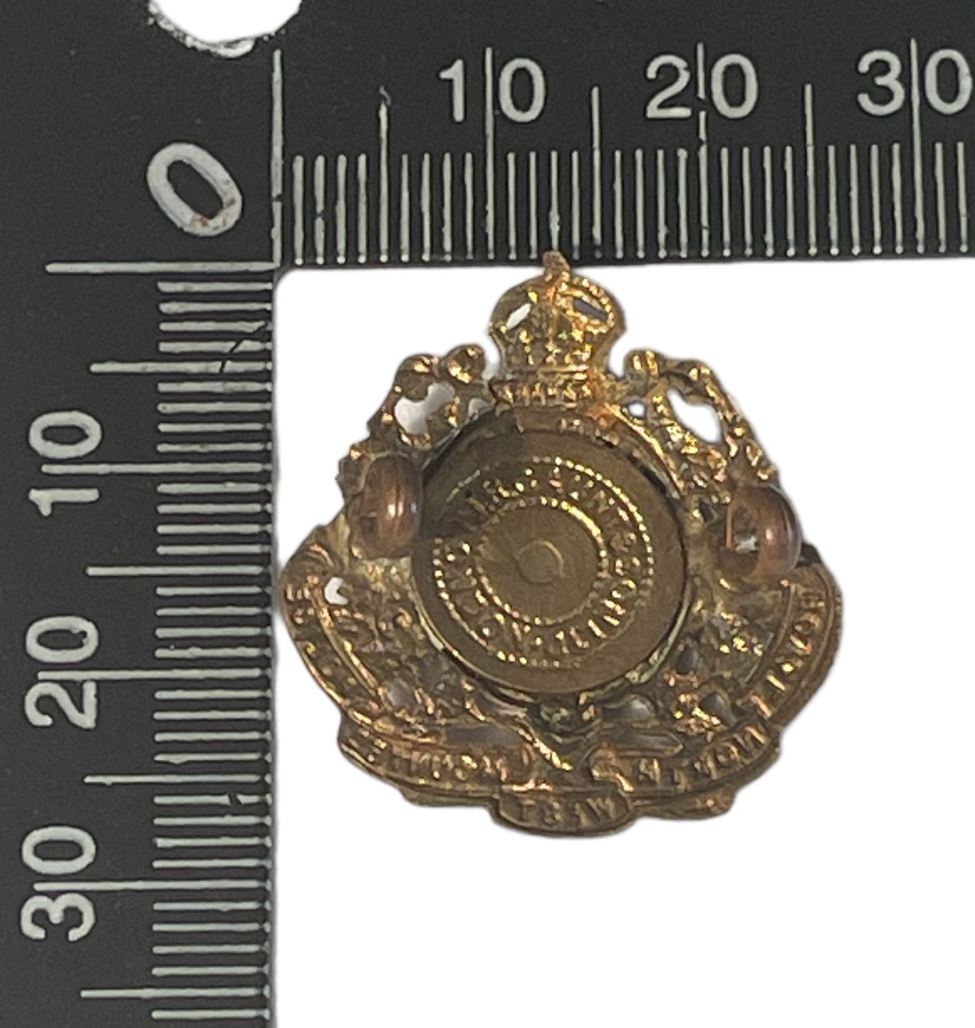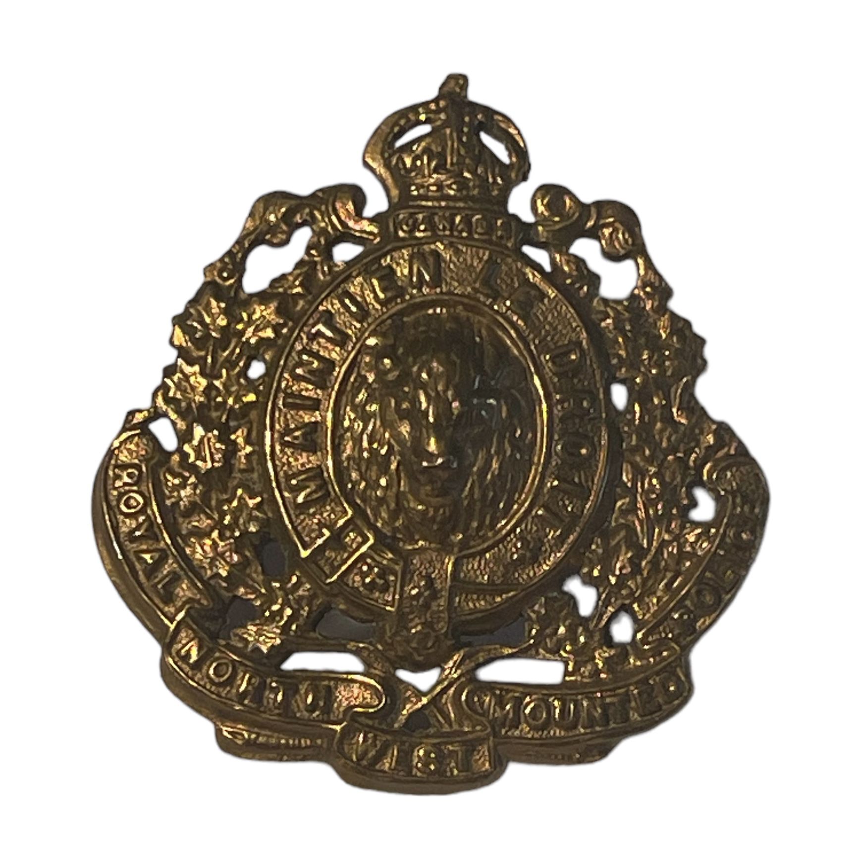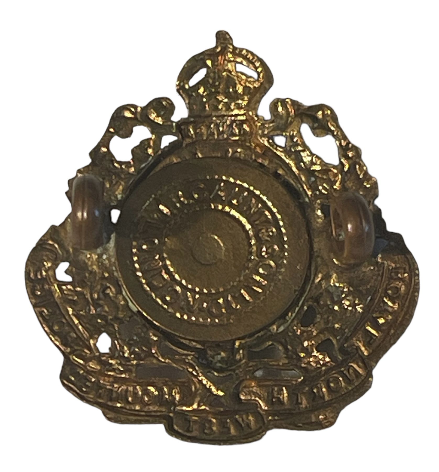 RNWMP. Darkened brass metal, with lug fasteners. Makers disk on the back.