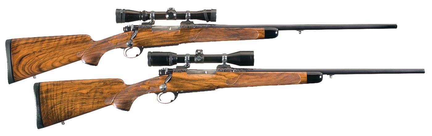 Royal Pair of Exquisite Custom Built and Engraved, Gold Inlaid Winchester Pre 64 Model 70 Bolt Actio