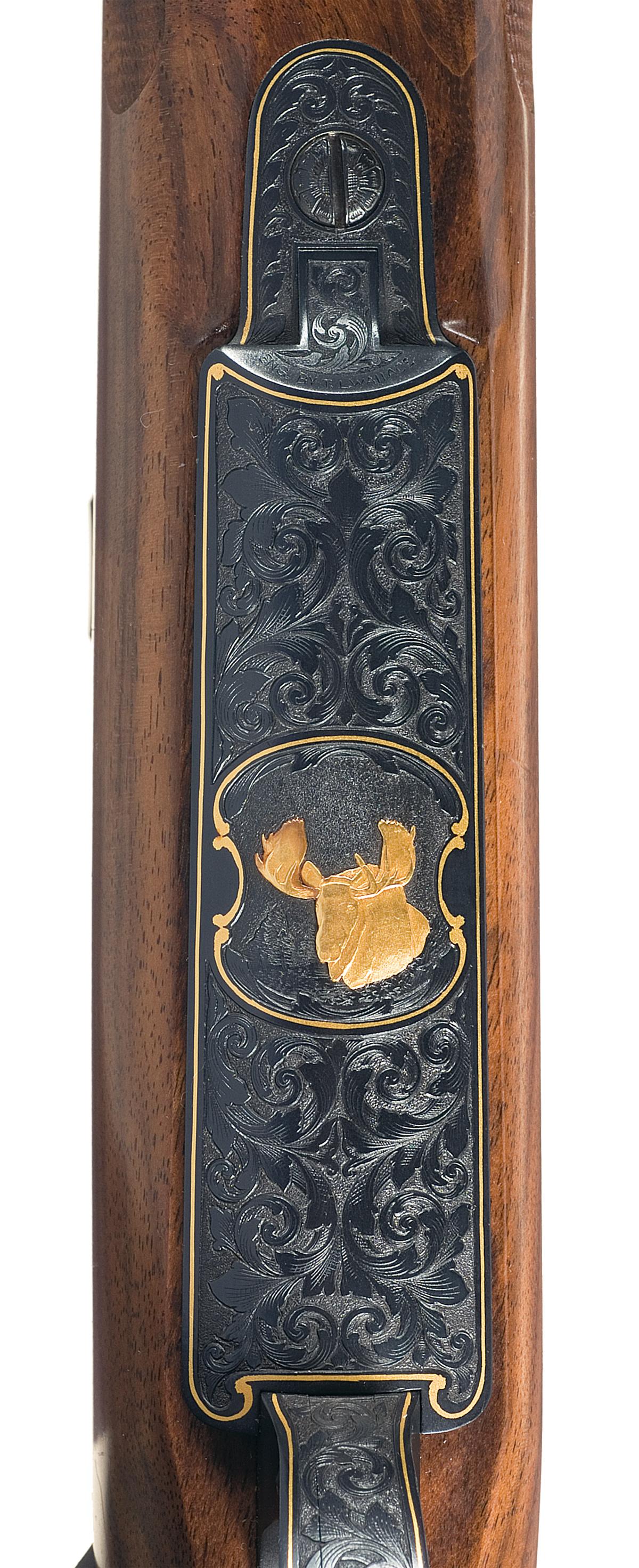 A) Excellent as custom built and engraved with virtually all of the blue finish remaining. All of the gold inlay remains and is bright. The stock is excellent with only a few very minor dings and dents, and sharp checkering. The scope is excellent with all of the original finish and clear optics. Crisp engraving. The action is excellent.