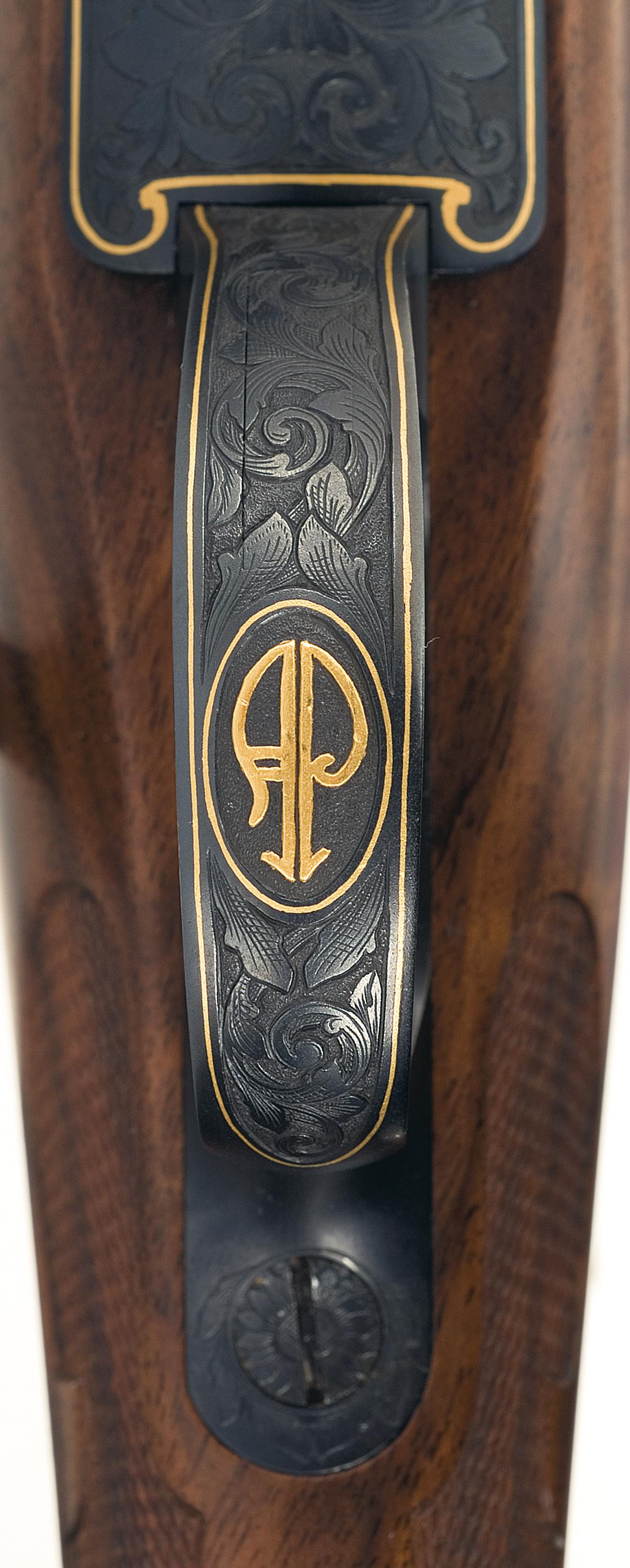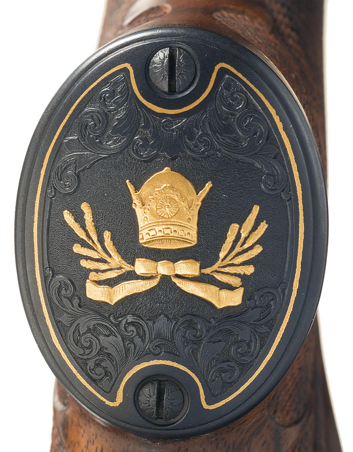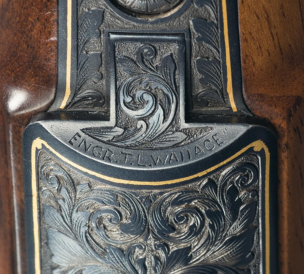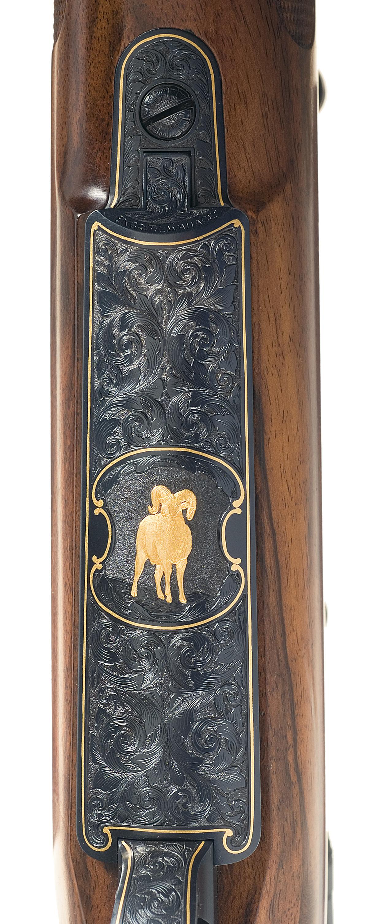 A) Manufactured in 1949 and subsequently custom built by Al Biesen of Spokane, Wa., and exquisitely hand engraved and gold inlaid by Master Engraver T.L. Wallace for his Imperial Highness Abdorreaz Pahlavi of Iran. Both men are deceased now, but were the best in the world at their craft when they worked on rifles. These rifles were made exactly to the expert specifications of his Highness, and he spared no expense when having these two hunting rifles built. This particular rifle is chambered in the 300 Win Magnum caliber and features a custom ported barrel made without sights and with a sling swivel stud on the bottom. The top of the barrel is marked "AL BIESEN GUNMAKER SPOKANE WN" and the left rear is marked "300 WIN. MAGNUM". The left side of the receiver is marked "WINCHESTER / -TRADE MARK-". The breech end of the barrel has a 3 1/2" wedge of floral scroll engraving with a punch dot background. The receiver, floor plate, trigger guard and grip cap are engraved with the same patterns. There is a small wedge of scroll engraving on the bolt handle and a rosette on the knob. The floor plate and hardware have a gold inlaid wire border with a gold inlaid moose in the center of the floor plate with a gold inlaid wire border around it. The trigger guard has a gold inlay wire border and gold inlaid "AP" in a gold inlaid oval on the bottom. The grip cap has a gold inlaid wire border with gold inlaid Royal Seal of the Pahlavi Family. Control round feed bolt actions with jeweled bolt, extractor, follower and top of the receiver on the right side. The rifles are mounted with exhibition quality, Fluer di Lis checkered French walnut stock with ebony forend, raised shadow line cheek piece, sling swivel stud and Pachmayr Decelerator recoil pad. Complete with a Leupold 2x7 Vari-X II scope with engraved rings and bases, and see through rubber lens caps. Prince Abdorreaz was arguably the greatest worldwide hunter and wildlife conservationist. As a hunter his peers could only include the likes of James (Jay) Mellon, Herb Klein, Elgin Gates, Jack O'Connor and C.J. McElroy. He was instrumental in supporting one of the worlds greatest conservation organizations in Europe, the C.I.C., was the founder and benefactor of the International foundation for the Conservation of Wildlife and was instrumental in setting up game reserves and implementing game laws in his native Iran, where he established more than 20 million acres of reserves and parks. Through his foundation, funding was provided for research, advising governments, training students, reintroducing wildlife, combating poaching, and protecting wildlife around the world. The Prince was the recipient of the Safari Club International's Hunting Hall of Fame in 1984, International Hunting award in 1988 and was the 7th winner of the Weatherby Big Game Award in 1962. He had taken over 260 varieties of big game animals and more than 400 record class trophies. Despite their exquisite features, the prince used these rifles in many a hunt, not left in a cabinet. The Prince was more at home in the mountains and plains than he was in a palace. He was one of the greatest marksmen of the 20th Century. He passed away in May of 2004. His hunting exploits are detailed in the Prince's book "Royal Quest, The Hunting Saga of H.I.H. Prince Abdorreza Pahlavi of Iran.