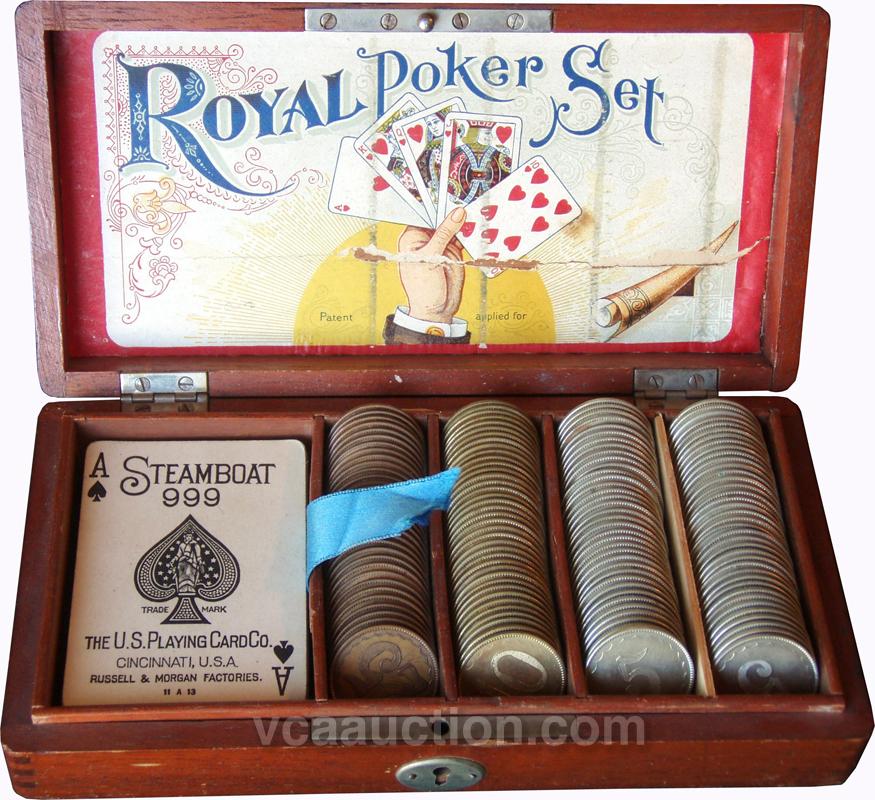 Royal Poker Set - Set features reeded metal counters in three denominations ($5, $10 and $25), an early plaid back Steamboat deck, and a wooden case with eye-opening graphics on the underside of the lid. Good condition; no key; c1900.