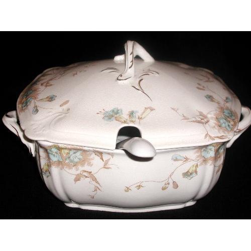 Royal English semi porcelain Johnson Bros tureen C.1920 has delicate trailing blue and yellow flowers with brown leaves and vines.Two handles have gold accent as well as the center handle. Solid white ladle. The three pieces are in excellent condition.No nicks,chips or cracks.Minor crazing to the lid only.The Royal semi porcelain Johnson Bros England symbol and stamp on bottom.