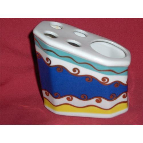 This is a very beautiful Royal Porcelain-Limoges tooth brush holder. It holds four brushes and a place for a tube of paste. Made on a slant for easy access. With an Art Deco flair, there is a band of light teal, royal blue and yellow with 24KT gold accents. Condition is excellent. Very fine quality. See photos. Have a look at my other items. Thank you for viewing.